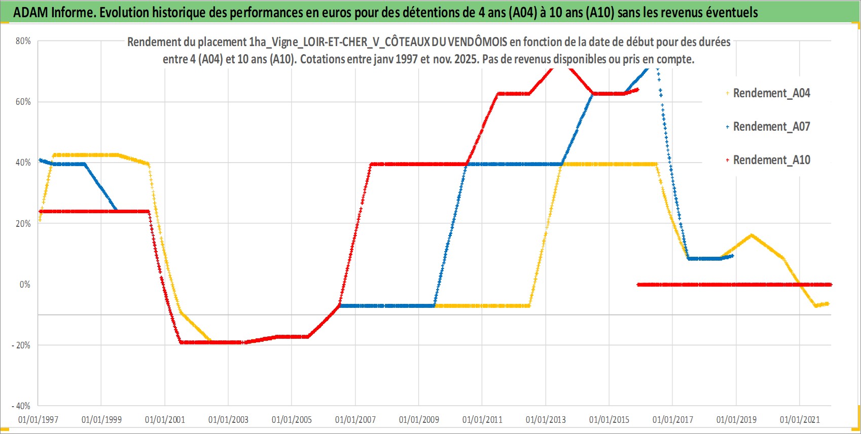 Site dédié aux investisseursPage dédiée sur site financeAnalyse des valorisations hebdomadaires de l'actif 1ha_Vigne_LOIR-ET-CHER_V_CÔTEAUX DU VENDÔMOIS. Cet actif est cote en EUR. Les valorisations couvrent les semaines 1997W01 a 2025W48. Les fermages de ce bien foncier sont pris egaux a 2,5% annuels de la valeur venale du bien.