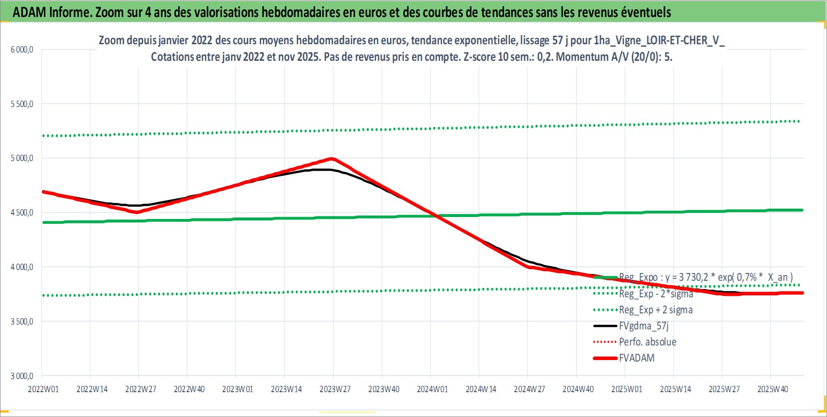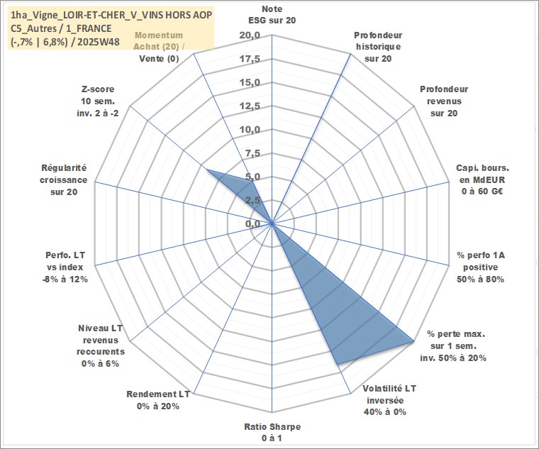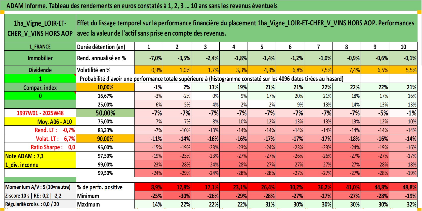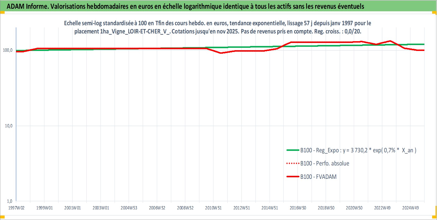 Site dédié aux investisseursPage dédiée sur site financeAnalyse des valorisations hebdomadaires de l'actif 1ha_Vigne_LOIR-ET-CHER_V_VINS HORS AOP. Cet actif est cote en EUR. Les valorisations couvrent les semaines 1997W01 a 2025W48. Les fermages de ce bien foncier sont pris egaux a 2,5% annuels de la valeur venale du bien.