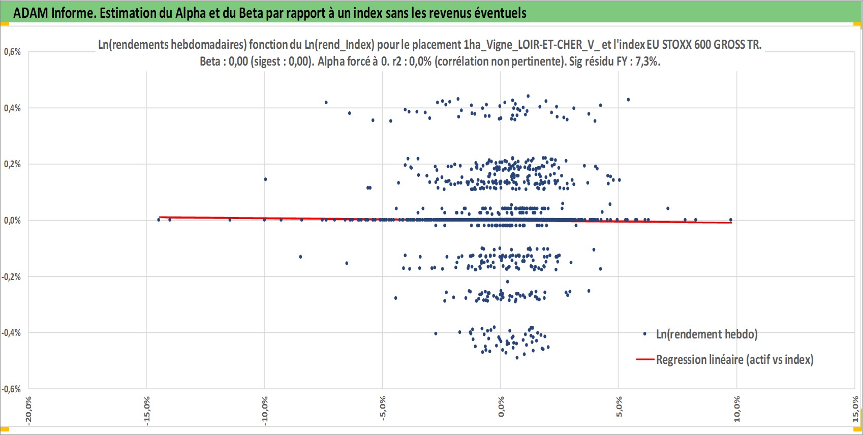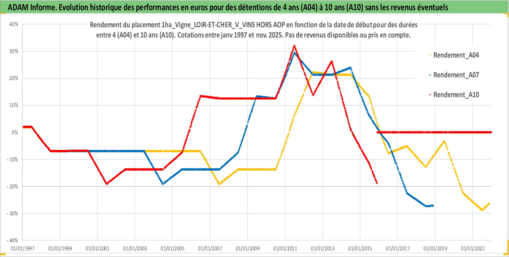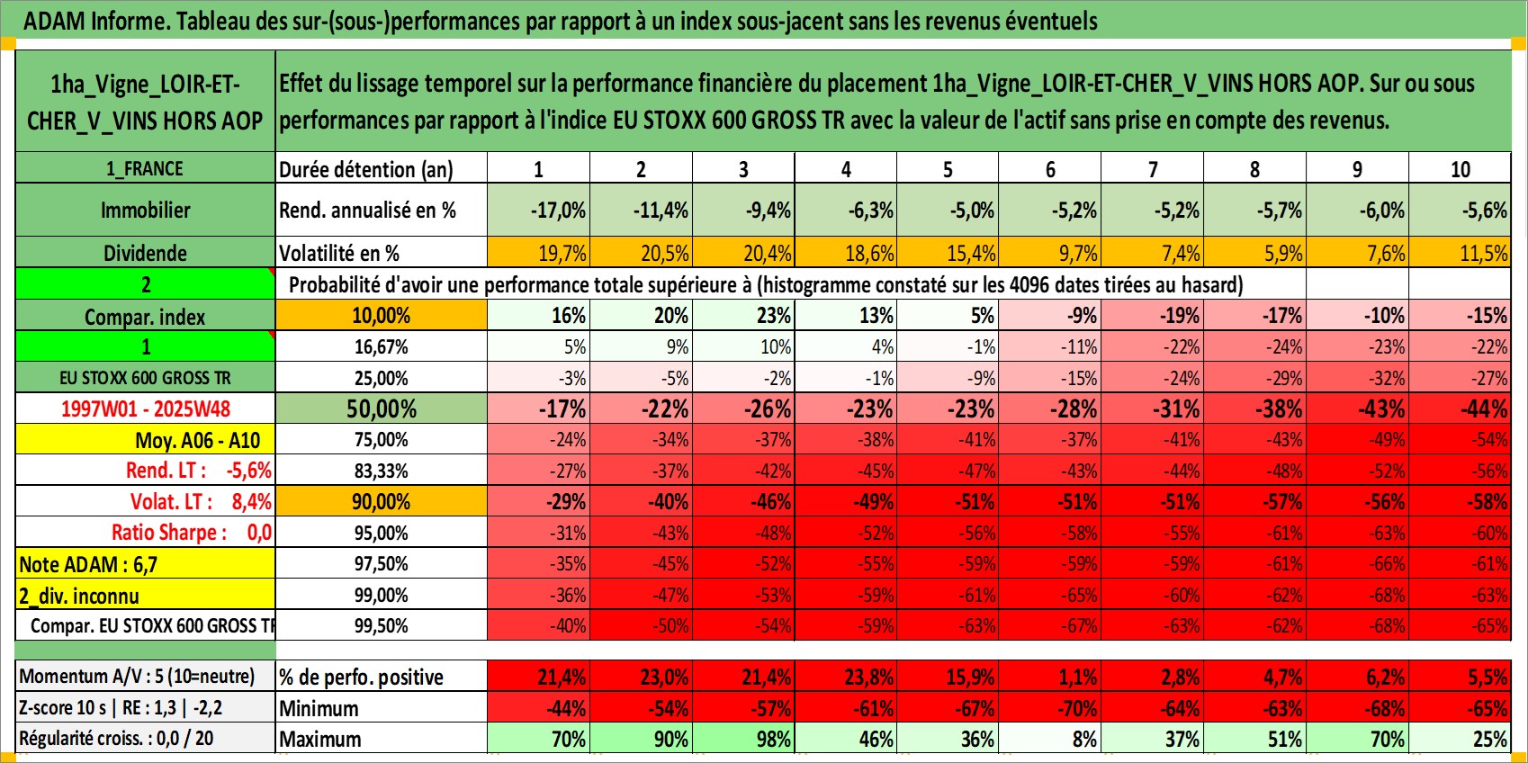 Site dédié aux investisseursPage dédiée sur site financeAnalyse des valorisations hebdomadaires de l'actif 1ha_Vigne_LOIR-ET-CHER_V_VINS HORS AOP. Cet actif est cote en EUR. Les valorisations couvrent les semaines 1997W01 a 2025W48. Les fermages de ce bien foncier sont pris egaux a 2,5% annuels de la valeur venale du bien.