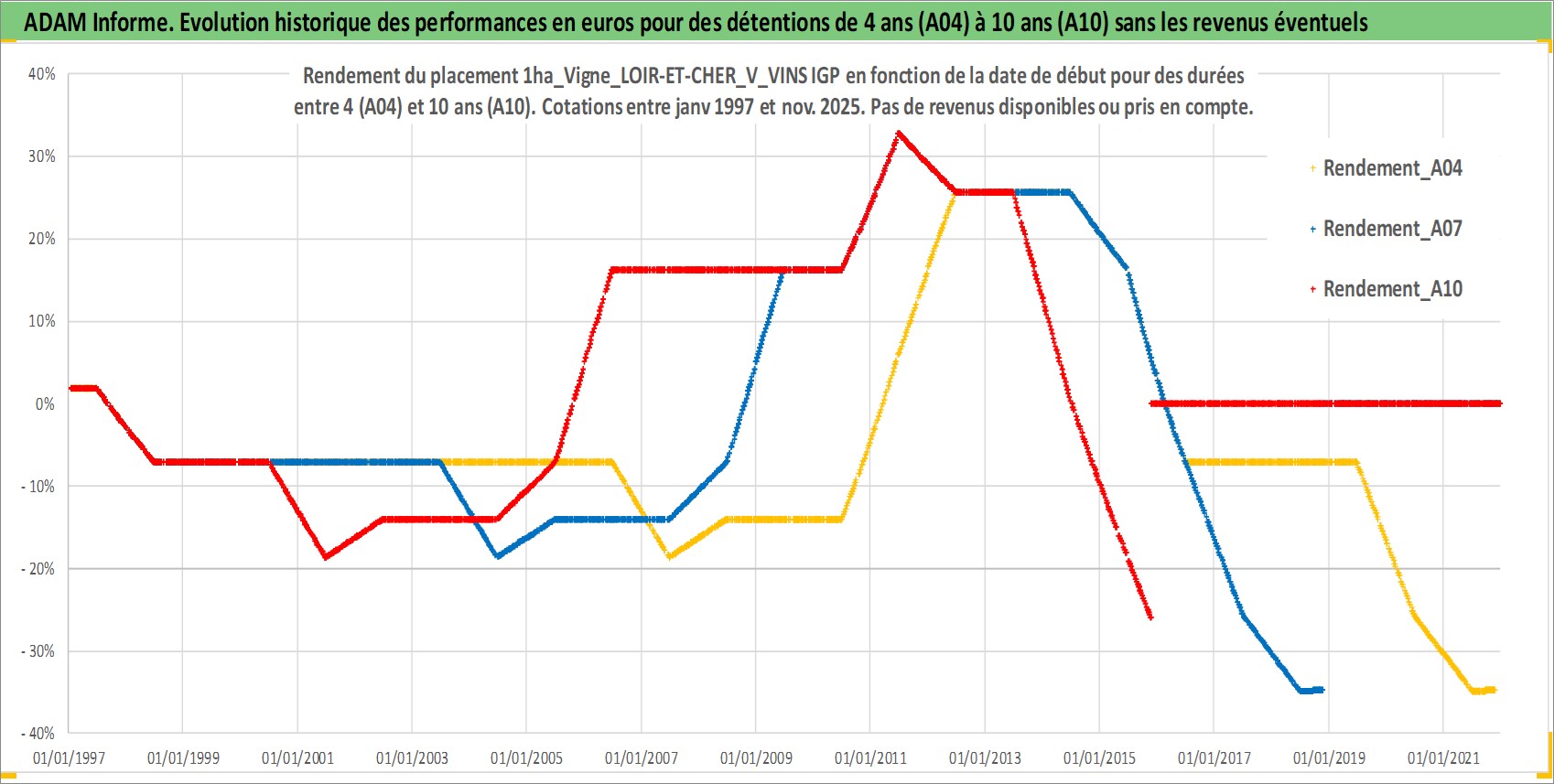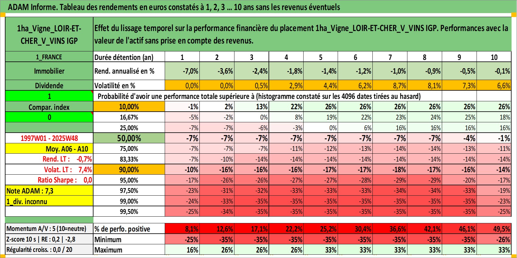 Site dédié aux investisseursPage dédiée sur site financeAnalyse des valorisations hebdomadaires de l'actif 1ha_Vigne_LOIR-ET-CHER_V_VINS IGP. Cet actif est cote en EUR. Les valorisations couvrent les semaines 1997W01 a 2025W48. Les fermages de ce bien foncier sont pris egaux a 2,5% annuels de la valeur venale du bien.