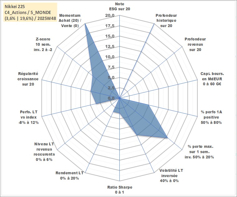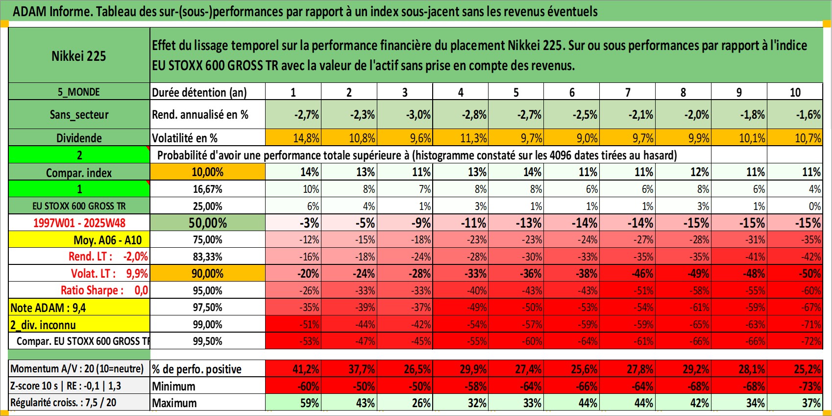 Site dédié aux investisseursPage dédiée sur site financeAnalyse des valorisations hebdomadaires de l'actif Nikkei 225. Cet actif est cote en JPY. Les valorisations sont en contrevaleur EURO et couvrent les semaines 1997W01 a 2025W48. Les revenus de cet actif financier ne sont pas connus car non existants ou non disponibles sur le site Yahoo Finance. La note ESG de cet actif n'est pas connue.