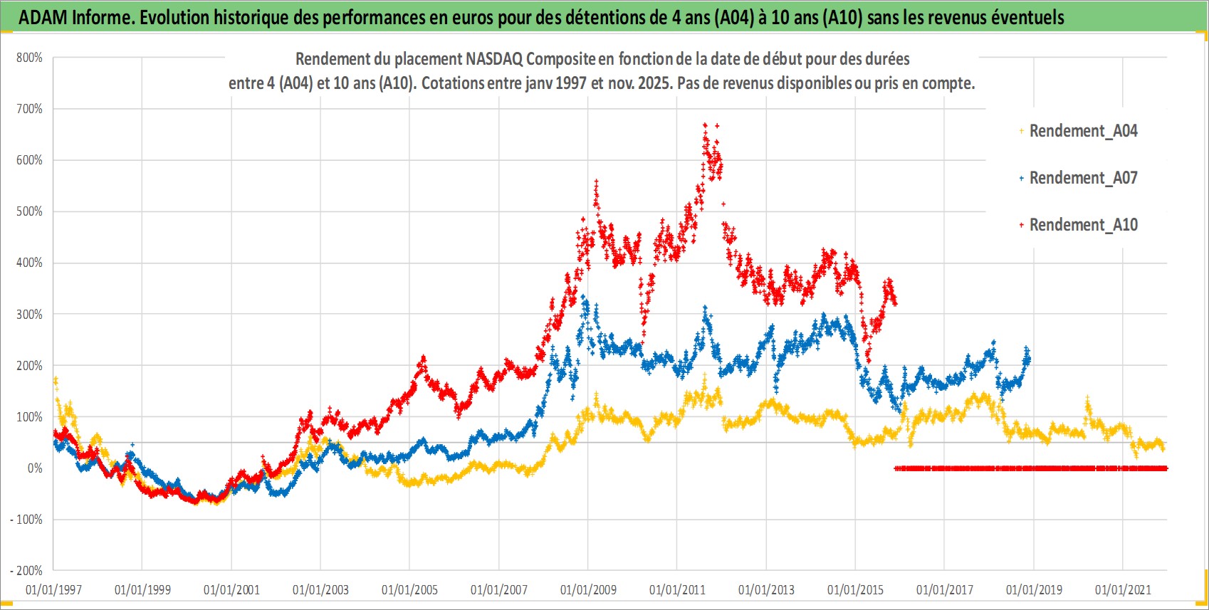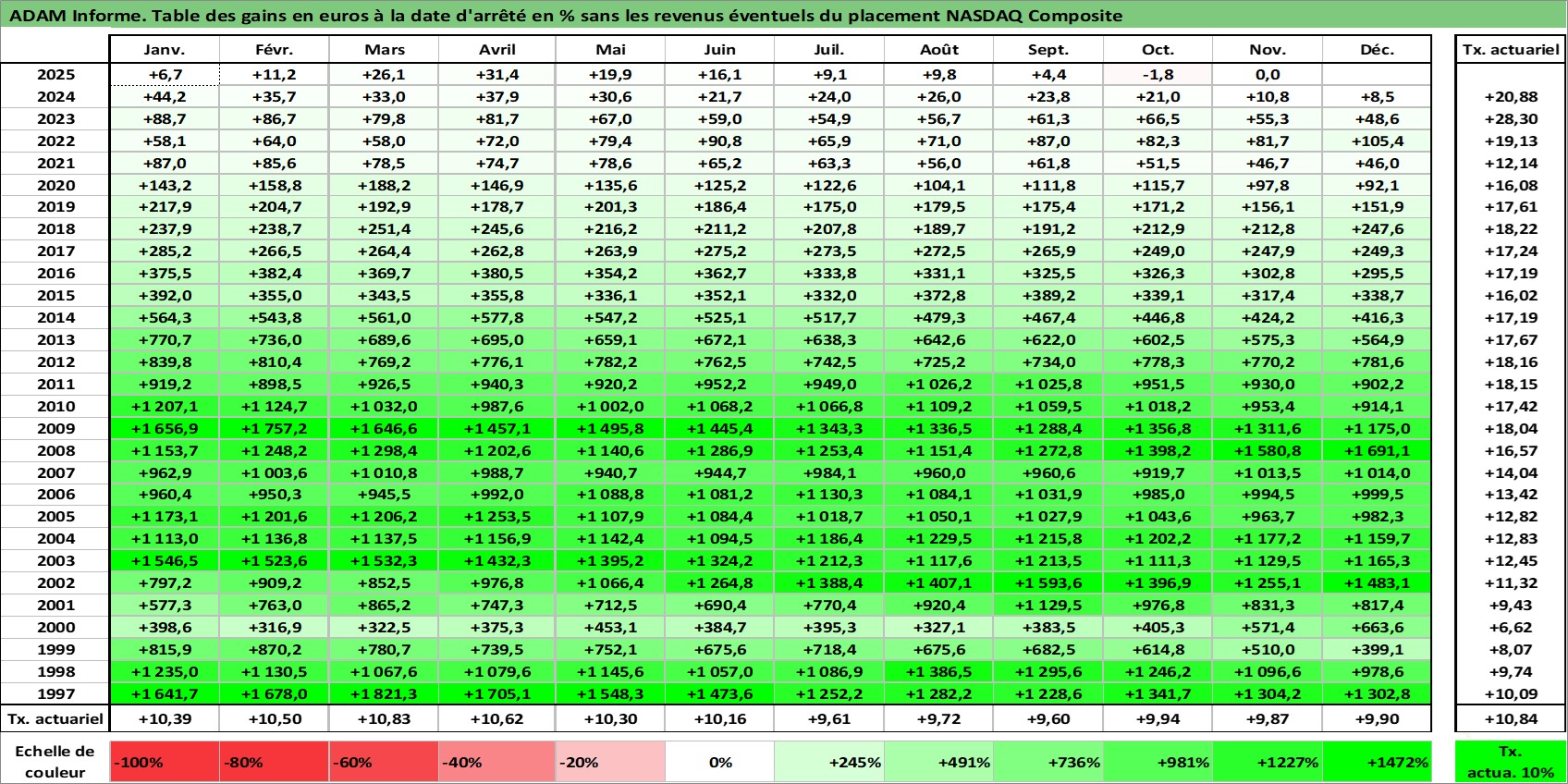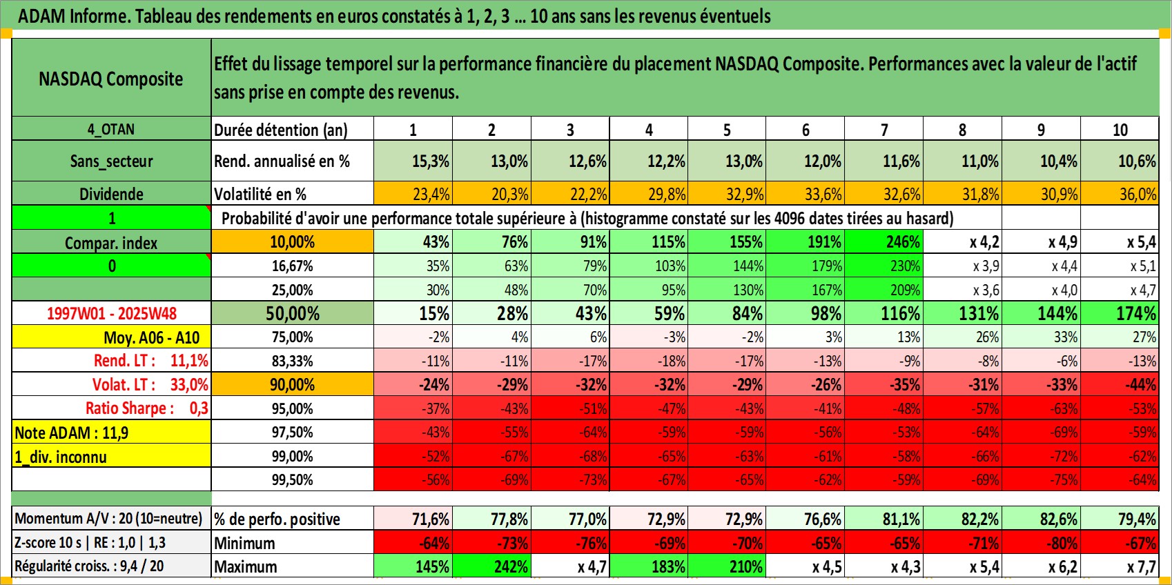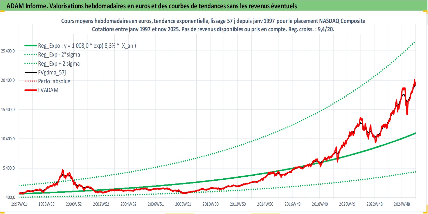 Site dédié aux investisseursPage dédiée sur site financeAnalyse des valorisations hebdomadaires de l'actif NASDAQ Composite. Cet actif est cote en USD. Les valorisations sont en contrevaleur EURO et couvrent les semaines 1997W01 a 2025W48. Les revenus de cet actif financier ne sont pas connus car non existants ou non disponibles sur le site Yahoo Finance. La note ESG de cet actif n'est pas connue.