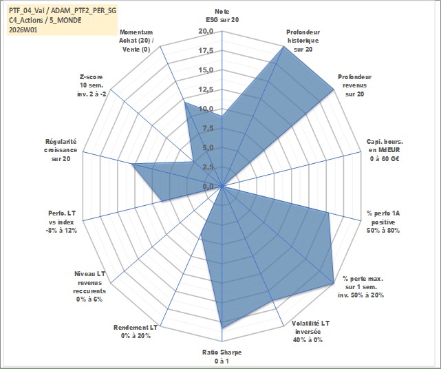 Site dédié aux investisseursPage dédiée sur site financeAnalyse des valorisations hebdomadaires du portefeuille PTF2_PER_SG_4actifs avec un profil P6_PurActions. Ce portefeuille est cote en EUR. Les valorisations couvrent les semaines 1997W01 a 2026W01. Les revenus de cet actif financier sont pris en compte depuis la semaine 1997W01. La note globale ESG de cet actif est estimee a 9.0 (apres rebasage entre 0 et 20).