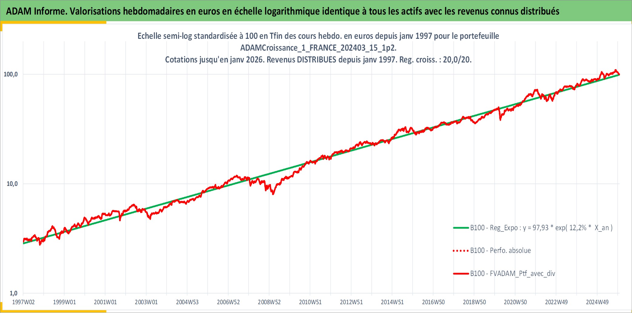 Site dédié aux investisseursPage dédiée sur site financeAnalyse des valorisations hebdomadaires du portefeuille ADAMCroissance_1_FRANCE_202403_15_1p2_4actifs avec un profil P6_PurActions. Ce portefeuille est cote en EUR. Les valorisations couvrent les semaines 1997W01 a 2026W01. Les revenus de cet actif financier sont pris en compte depuis la semaine 1997W01. La note globale ESG de cet actif est estimee a 13.5 (apres rebasage entre 0 et 20).