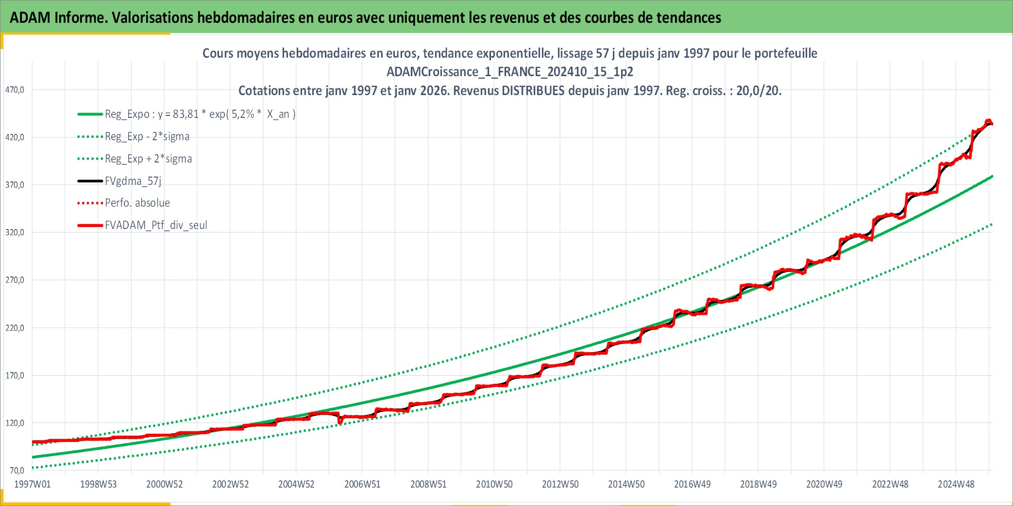 Site dédié aux investisseursPage dédiée sur site financeAnalyse des valorisations hebdomadaires du portefeuille ADAMCroissance_1_FRANCE_202410_15_1p2_3actifs avec un profil P6_PurActions. Ce portefeuille est cote en EUR. Les valorisations couvrent les semaines 1997W01 a 2026W01. Les revenus de cet actif financier sont pris en compte depuis la semaine 1997W01. La note globale ESG de cet actif est estimee a 12.3 (apres rebasage entre 0 et 20).