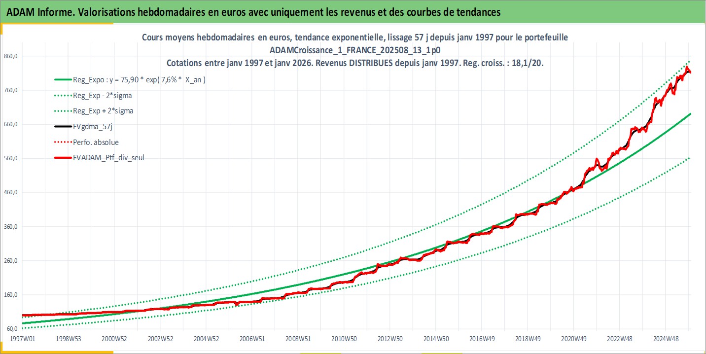 Site dédié aux investisseursPage dédiée sur site financeAnalyse des valorisations hebdomadaires du portefeuille ADAMCroissance_1_FRANCE_202508_13_1p0_5actifs avec un profil P6_PurActions. Ce portefeuille est cote en EUR. Les valorisations couvrent les semaines 1997W01 a 2026W01. Les revenus de cet actif financier sont pris en compte depuis la semaine 1997W01. La note globale ESG de cet actif est estimee a 12.2 (apres rebasage entre 0 et 20).