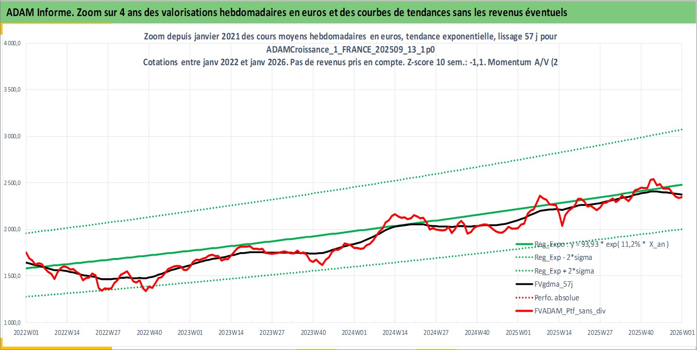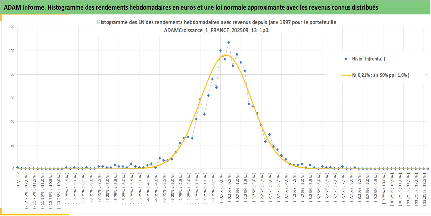 Site dédié aux investisseursPage dédiée sur site financeAnalyse des valorisations hebdomadaires du portefeuille ADAMCroissance_1_FRANCE_202509_13_1p0_5actifs avec un profil P6_PurActions. Ce portefeuille est cote en EUR. Les valorisations couvrent les semaines 1997W01 a 2026W01. Les revenus de cet actif financier sont pris en compte depuis la semaine 1997W01. La note globale ESG de cet actif est estimee a 13.5 (apres rebasage entre 0 et 20).