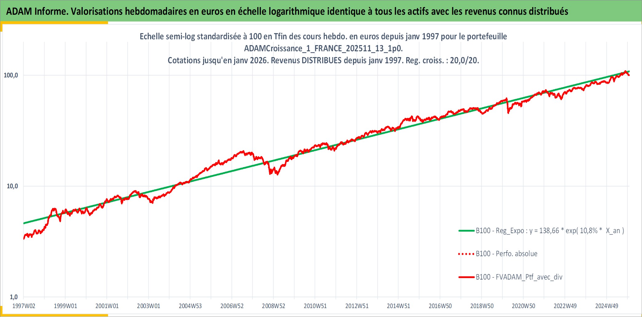 Site dédié aux investisseursPage dédiée sur site financeAnalyse des valorisations hebdomadaires du portefeuille ADAMCroissance_1_FRANCE_202511_13_1p0_4actifs avec un profil P6_PurActions. Ce portefeuille est cote en EUR. Les valorisations couvrent les semaines 1997W01 a 2026W01. Les revenus de cet actif financier sont pris en compte depuis la semaine 1997W01. La note globale ESG de cet actif est estimee a 11.0 (apres rebasage entre 0 et 20).