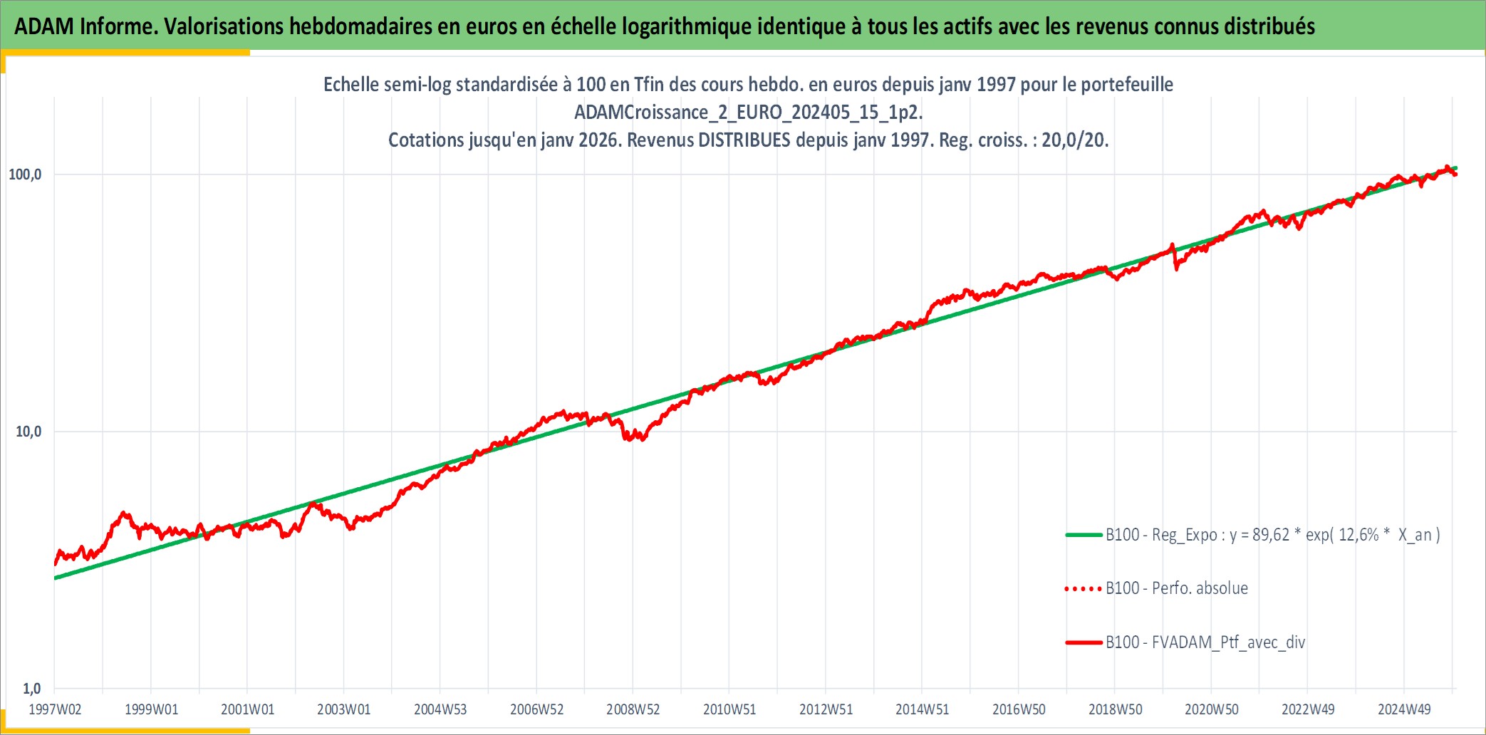 Site dédié aux investisseursPage dédiée sur site financeAnalyse des valorisations hebdomadaires du portefeuille ADAMCroissance_2_EURO_202405_15_1p2_5actifs avec un profil P6_PurActions. Ce portefeuille est cote en EUR. Les valorisations couvrent les semaines 1997W01 a 2026W01. Les revenus de cet actif financier sont pris en compte depuis la semaine 1997W01. La note globale ESG de cet actif est estimee a 13.7 (apres rebasage entre 0 et 20).