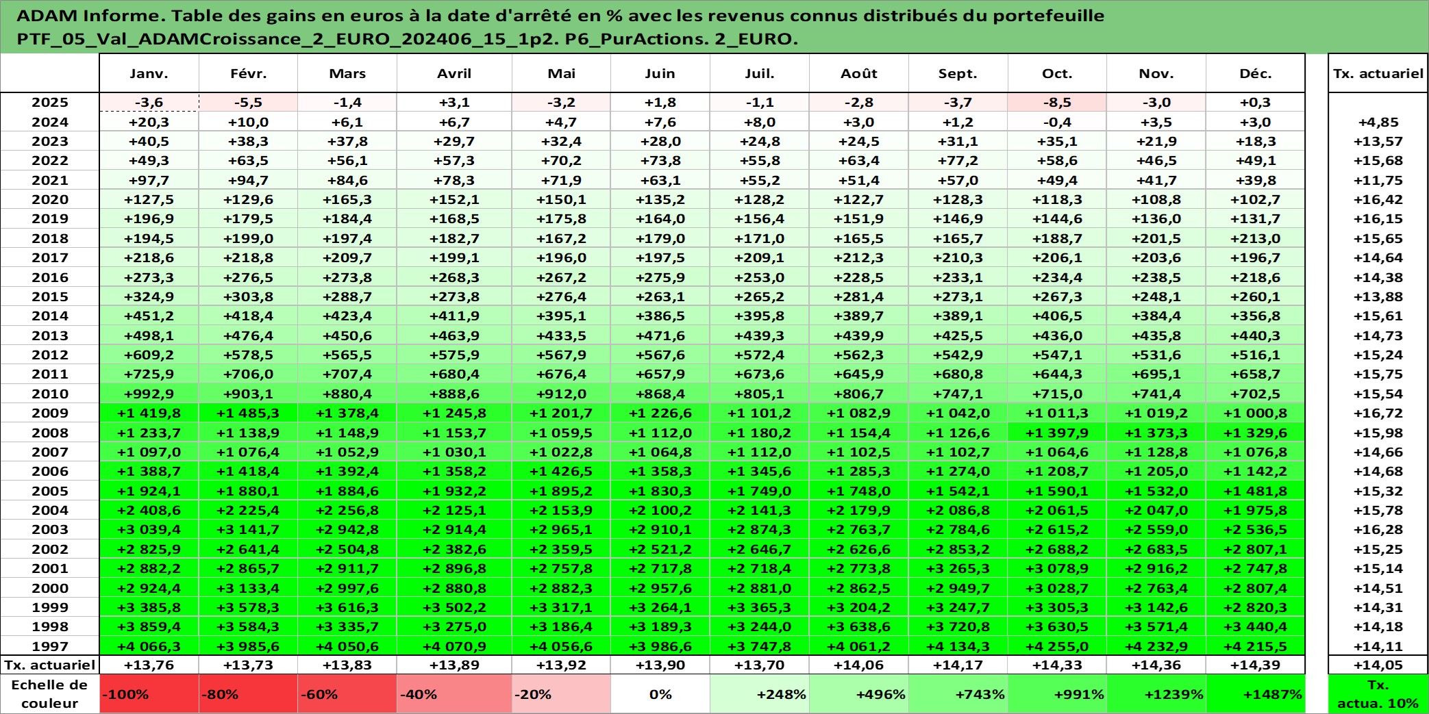 Site dédié aux investisseursPage dédiée sur site financeAnalyse des valorisations hebdomadaires du portefeuille ADAMCroissance_2_EURO_202406_15_1p2_5actifs avec un profil P6_PurActions. Ce portefeuille est cote en EUR. Les valorisations couvrent les semaines 1997W01 a 2026W01. Les revenus de cet actif financier sont pris en compte depuis la semaine 1997W01. La note globale ESG de cet actif est estimee a 13.5 (apres rebasage entre 0 et 20).
