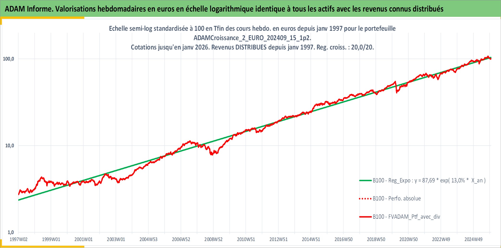 Site dédié aux investisseursPage dédiée sur site financeAnalyse des valorisations hebdomadaires du portefeuille ADAMCroissance_2_EURO_202409_15_1p2_6actifs avec un profil P6_PurActions. Ce portefeuille est cote en EUR. Les valorisations couvrent les semaines 1997W01 a 2026W01. Les revenus de cet actif financier sont pris en compte depuis la semaine 1997W01. La note globale ESG de cet actif est estimee a 12.2 (apres rebasage entre 0 et 20).