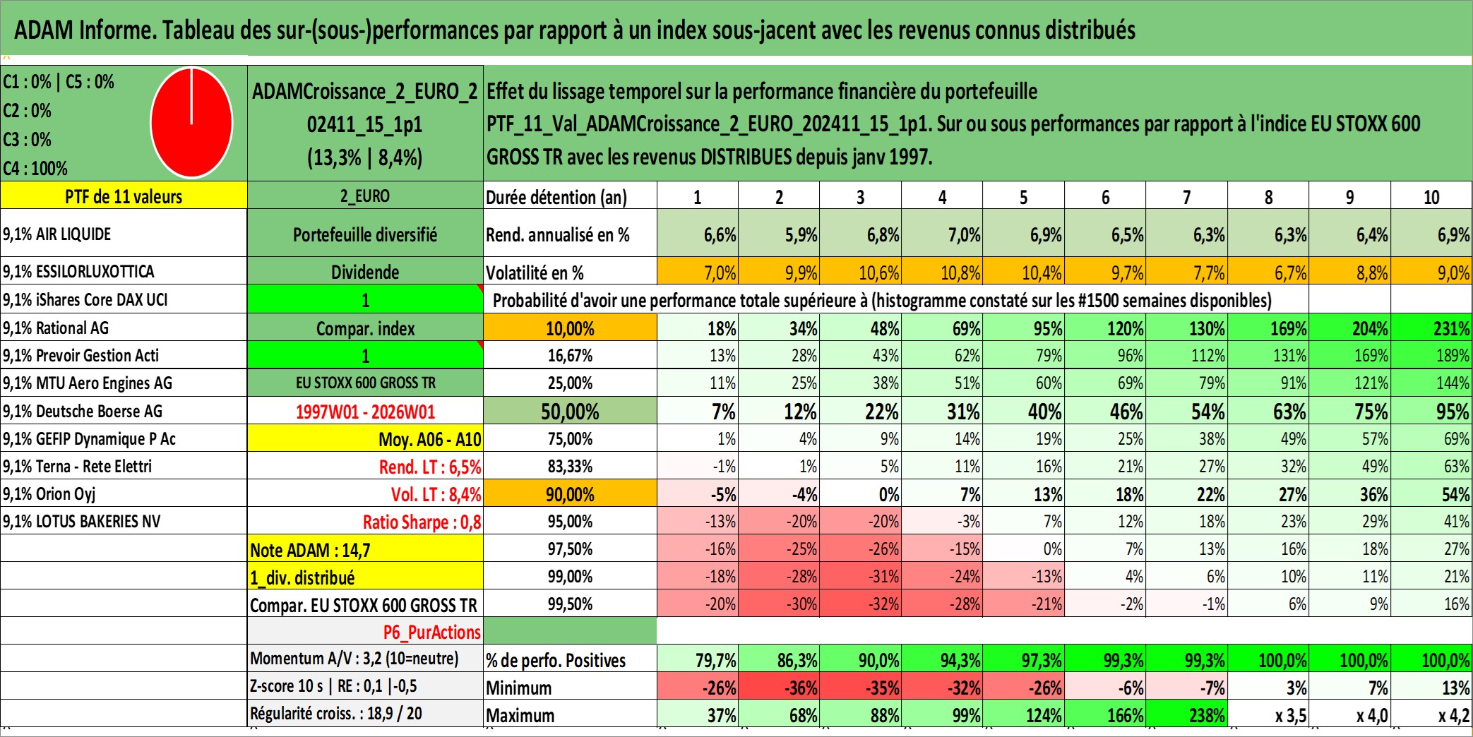 Site dédié aux investisseursPage dédiée sur site financeAnalyse des valorisations hebdomadaires du portefeuille ADAMCroissance_2_EURO_202411_15_1p1_11actifs avec un profil P6_PurActions. Ce portefeuille est cote en EUR. Les valorisations couvrent les semaines 1997W01 a 2026W01. Les revenus de cet actif financier sont pris en compte depuis la semaine 1997W01. La note globale ESG de cet actif est estimee a 10.9 (apres rebasage entre 0 et 20).