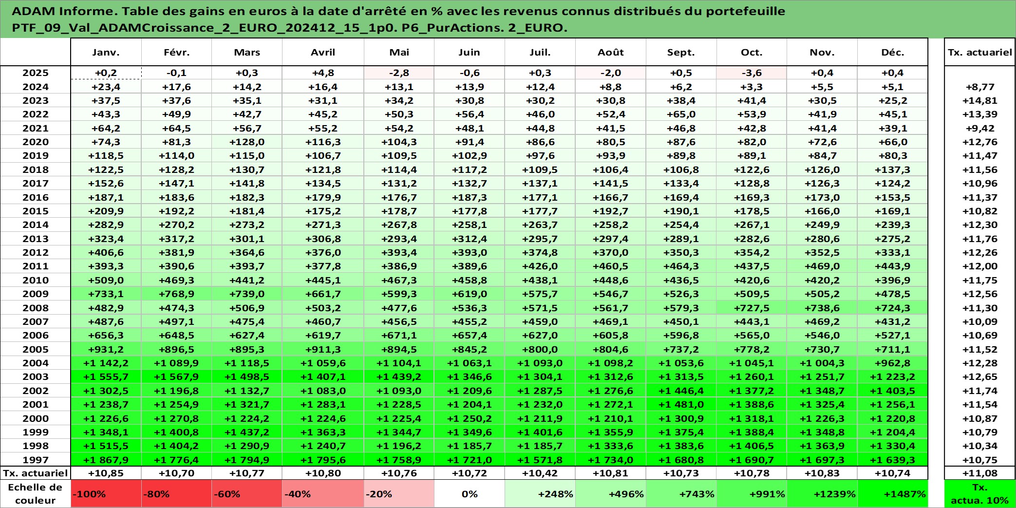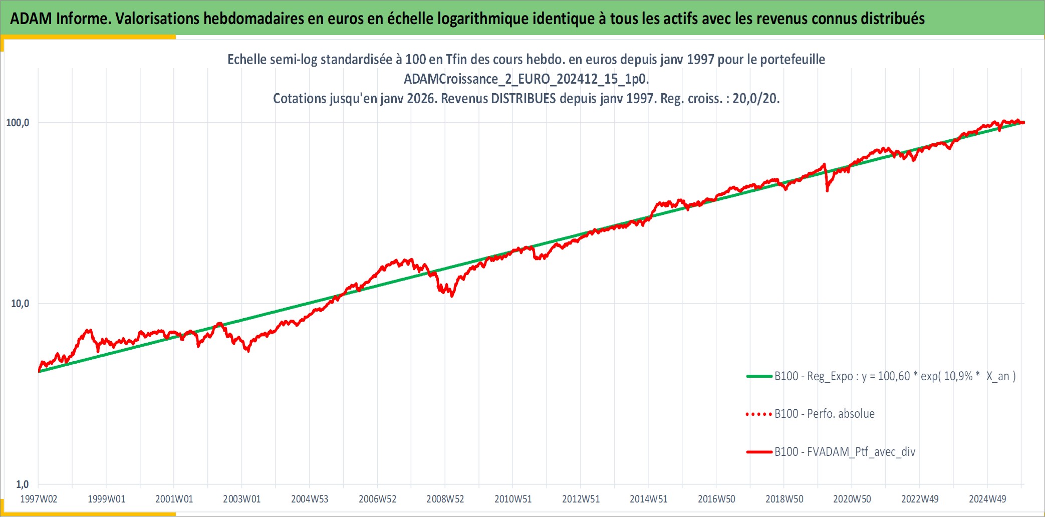 Site dédié aux investisseursPage dédiée sur site financeAnalyse des valorisations hebdomadaires du portefeuille ADAMCroissance_2_EURO_202412_15_1p0_9actifs avec un profil P6_PurActions. Ce portefeuille est cote en EUR. Les valorisations couvrent les semaines 1997W01 a 2026W01. Les revenus de cet actif financier sont pris en compte depuis la semaine 1997W01. La note globale ESG de cet actif est estimee a 12.2 (apres rebasage entre 0 et 20).
