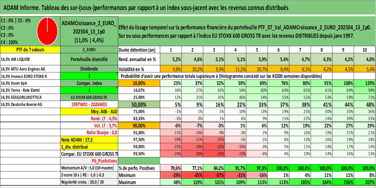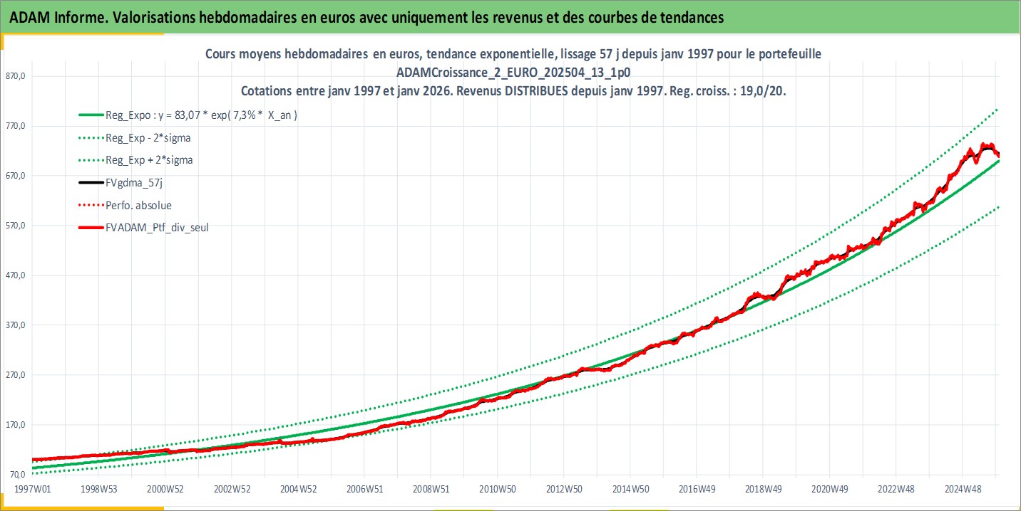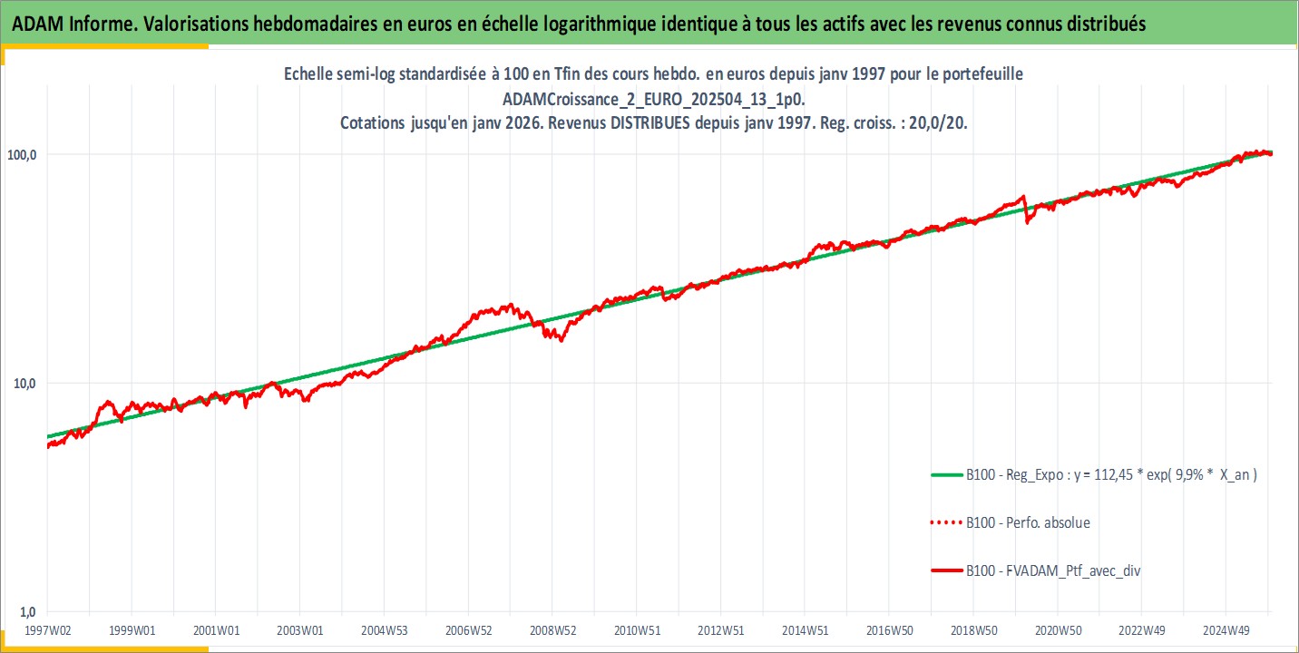 Site dédié aux investisseursPage dédiée sur site financeAnalyse des valorisations hebdomadaires du portefeuille ADAMCroissance_2_EURO_202504_13_1p0_7actifs avec un profil P6_PurActions. Ce portefeuille est cote en EUR. Les valorisations couvrent les semaines 1997W01 a 2026W01. Les revenus de cet actif financier sont pris en compte depuis la semaine 1997W01. La note globale ESG de cet actif est estimee a 12.7 (apres rebasage entre 0 et 20).