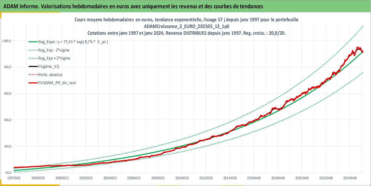 Site dédié aux investisseursPage dédiée sur site financeAnalyse des valorisations hebdomadaires du portefeuille ADAMCroissance_2_EURO_202505_13_1p0_10actifs avec un profil P6_PurActions. Ce portefeuille est cote en EUR. Les valorisations couvrent les semaines 1997W01 a 2026W01. Les revenus de cet actif financier sont pris en compte depuis la semaine 1997W01. La note globale ESG de cet actif est estimee a 12.0 (apres rebasage entre 0 et 20).