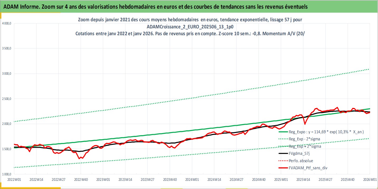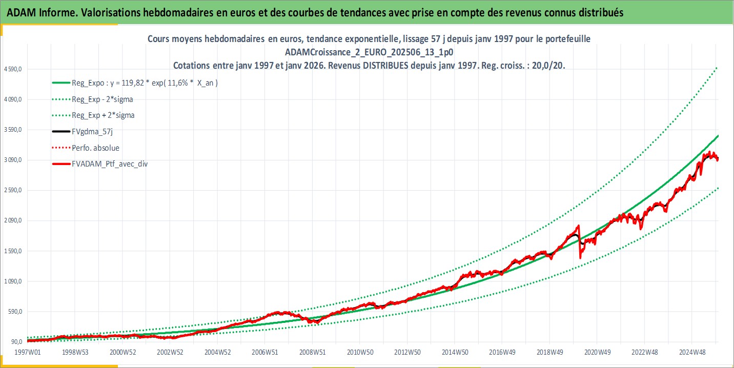 Site dédié aux investisseursPage dédiée sur site financeAnalyse des valorisations hebdomadaires du portefeuille ADAMCroissance_2_EURO_202506_13_1p0_10actifs avec un profil P6_PurActions. Ce portefeuille est cote en EUR. Les valorisations couvrent les semaines 1997W01 a 2026W01. Les revenus de cet actif financier sont pris en compte depuis la semaine 1997W01. La note globale ESG de cet actif est estimee a 12.0 (apres rebasage entre 0 et 20).
