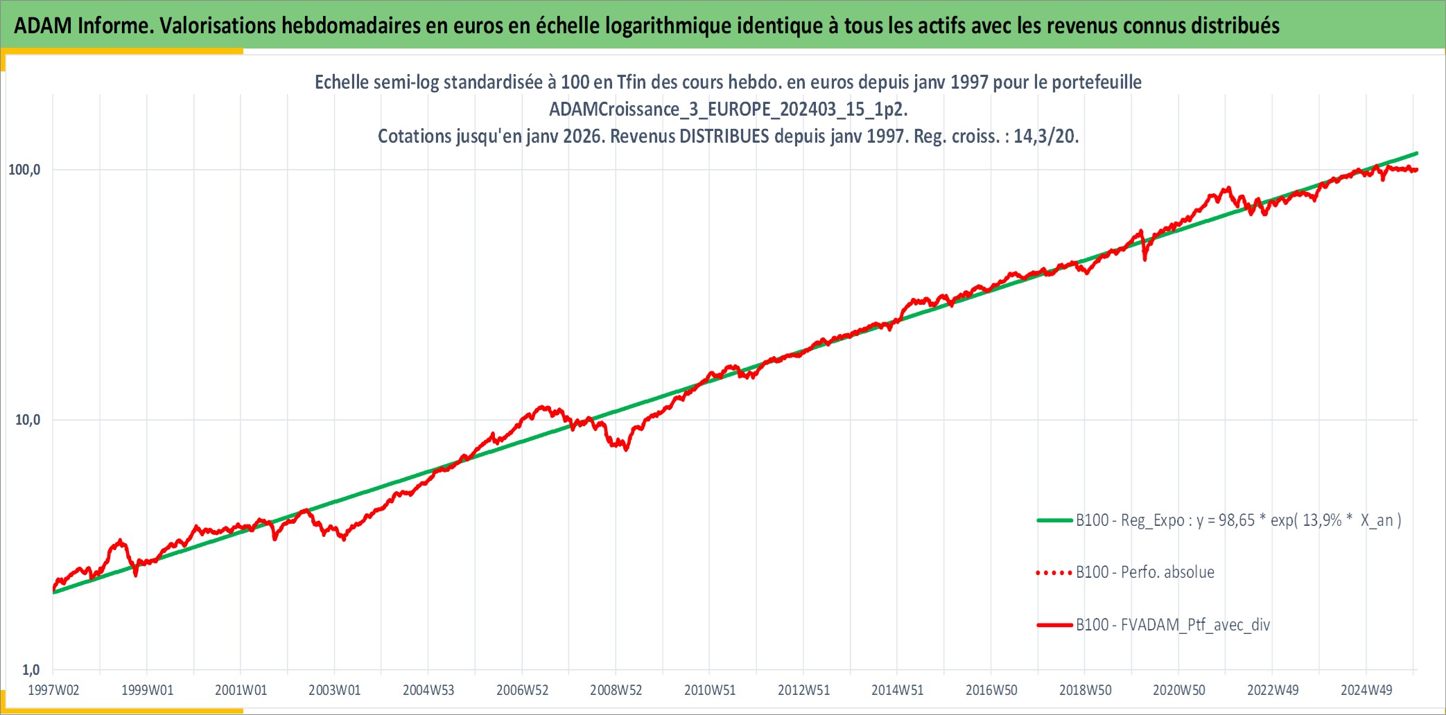 Site dédié aux investisseursPage dédiée sur site financeAnalyse des valorisations hebdomadaires du portefeuille ADAMCroissance_3_EUROPE_202403_15_1p2_23actifs avec un profil P6_PurActions. Ce portefeuille est cote en EUR. Les valorisations couvrent les semaines 1997W01 a 2026W01. Les revenus de cet actif financier sont pris en compte depuis la semaine 1997W01. La note globale ESG de cet actif est estimee a 12.9 (apres rebasage entre 0 et 20).