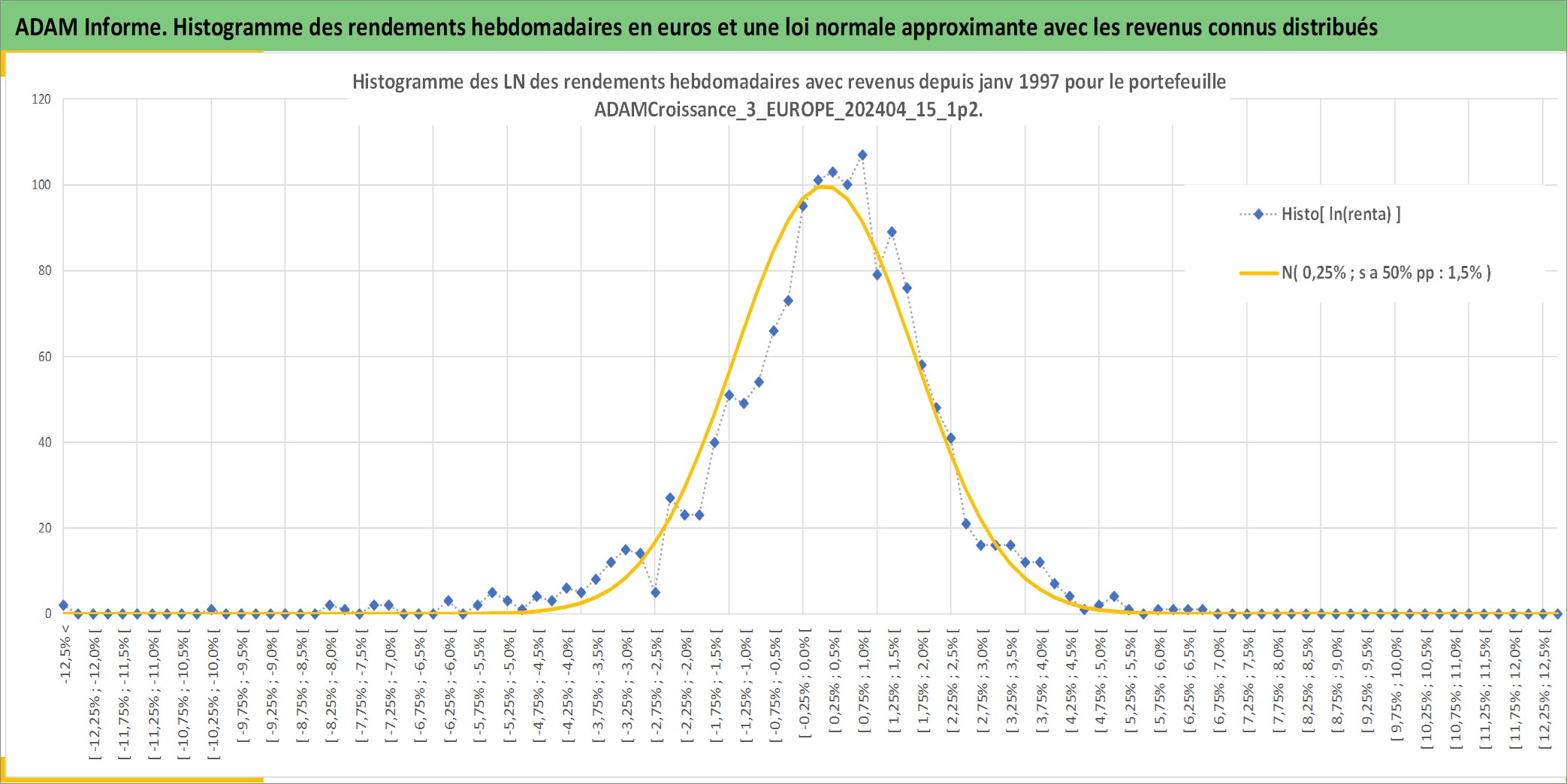 Site dédié aux investisseursPage dédiée sur site financeAnalyse des valorisations hebdomadaires du portefeuille ADAMCroissance_3_EUROPE_202404_15_1p2_10actifs avec un profil P6_PurActions. Ce portefeuille est cote en EUR. Les valorisations couvrent les semaines 1997W01 a 2026W01. Les revenus de cet actif financier sont pris en compte depuis la semaine 1997W01. La note globale ESG de cet actif est estimee a 13.8 (apres rebasage entre 0 et 20).