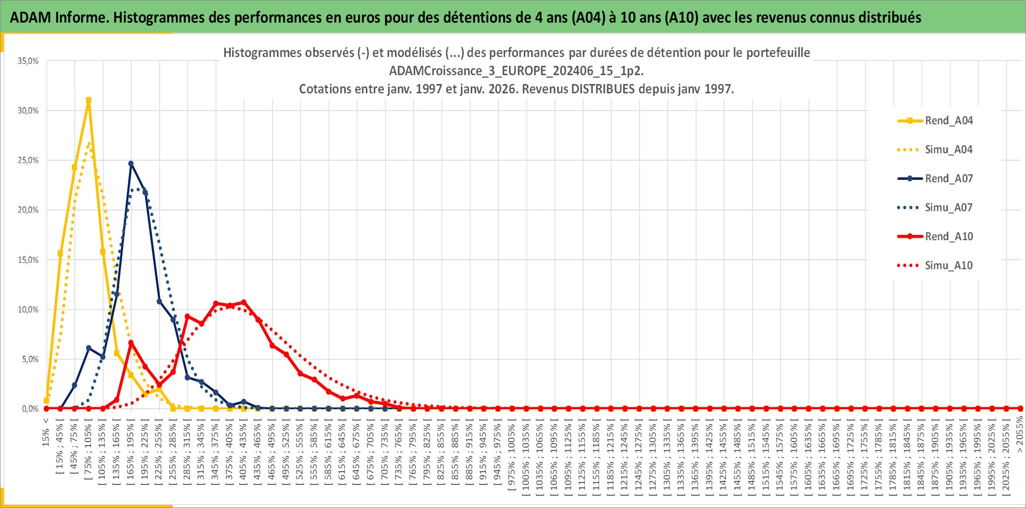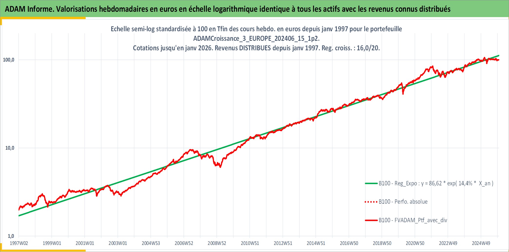 Site dédié aux investisseursPage dédiée sur site financeAnalyse des valorisations hebdomadaires du portefeuille ADAMCroissance_3_EUROPE_202406_15_1p2_18actifs avec un profil P6_PurActions. Ce portefeuille est cote en EUR. Les valorisations couvrent les semaines 1997W01 a 2026W01. Les revenus de cet actif financier sont pris en compte depuis la semaine 1997W01. La note globale ESG de cet actif est estimee a 12.9 (apres rebasage entre 0 et 20).