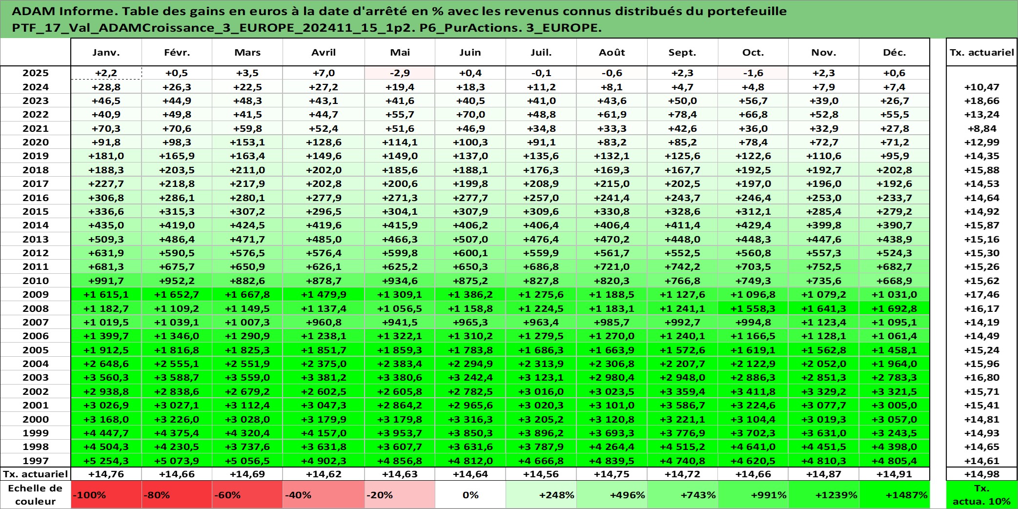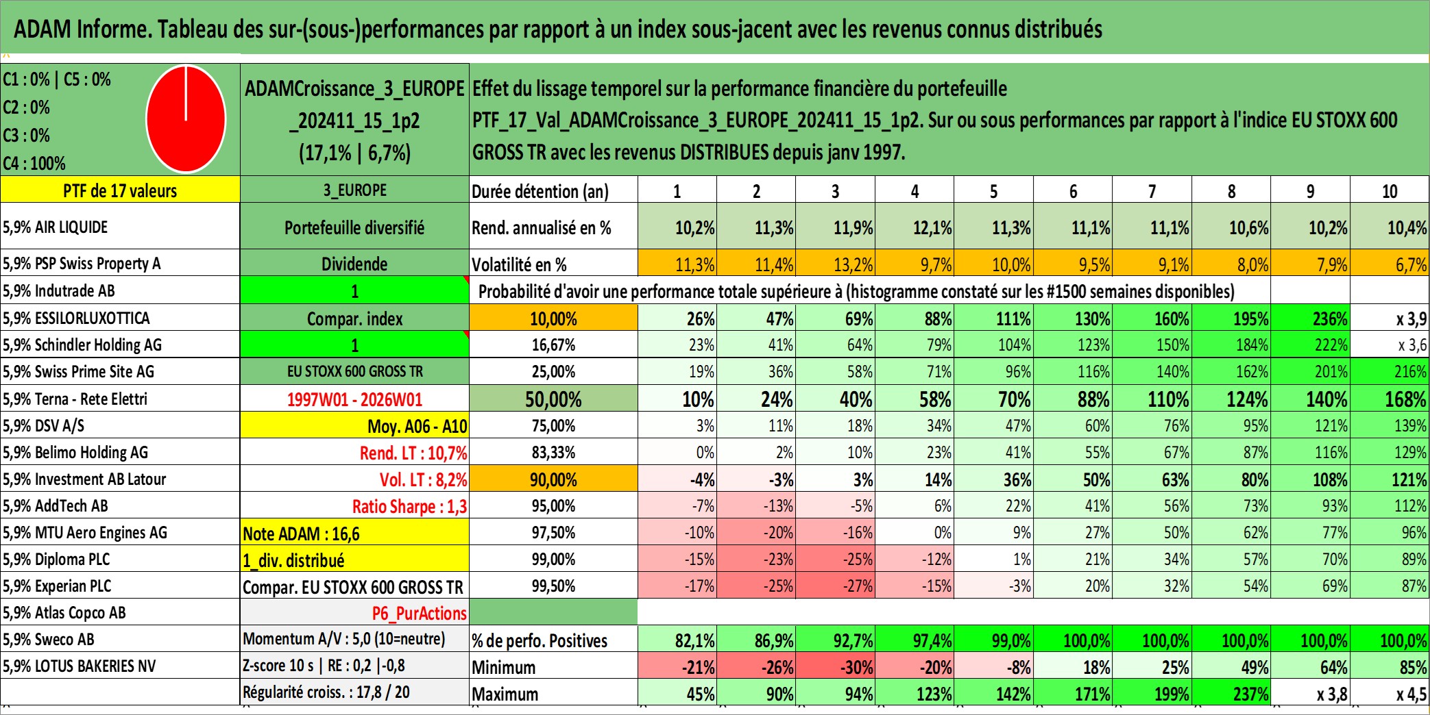 Site dédié aux investisseursPage dédiée sur site financeAnalyse des valorisations hebdomadaires du portefeuille ADAMCroissance_3_EUROPE_202411_15_1p2_17actifs avec un profil P6_PurActions. Ce portefeuille est cote en EUR. Les valorisations couvrent les semaines 1997W01 a 2026W01. Les revenus de cet actif financier sont pris en compte depuis la semaine 1997W01. La note globale ESG de cet actif est estimee a 13.0 (apres rebasage entre 0 et 20).
