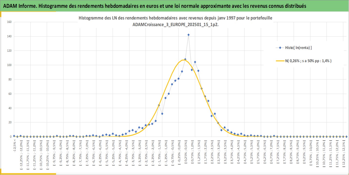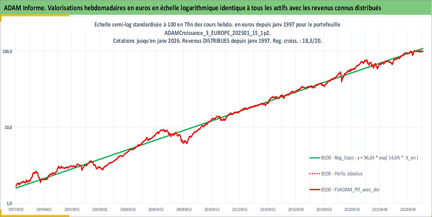 Site dédié aux investisseursPage dédiée sur site financeAnalyse des valorisations hebdomadaires du portefeuille ADAMCroissance_3_EUROPE_202501_15_1p2_17actifs avec un profil P6_PurActions. Ce portefeuille est cote en EUR. Les valorisations couvrent les semaines 1997W01 a 2026W01. Les revenus de cet actif financier sont pris en compte depuis la semaine 1997W01. La note globale ESG de cet actif est estimee a 13.0 (apres rebasage entre 0 et 20).