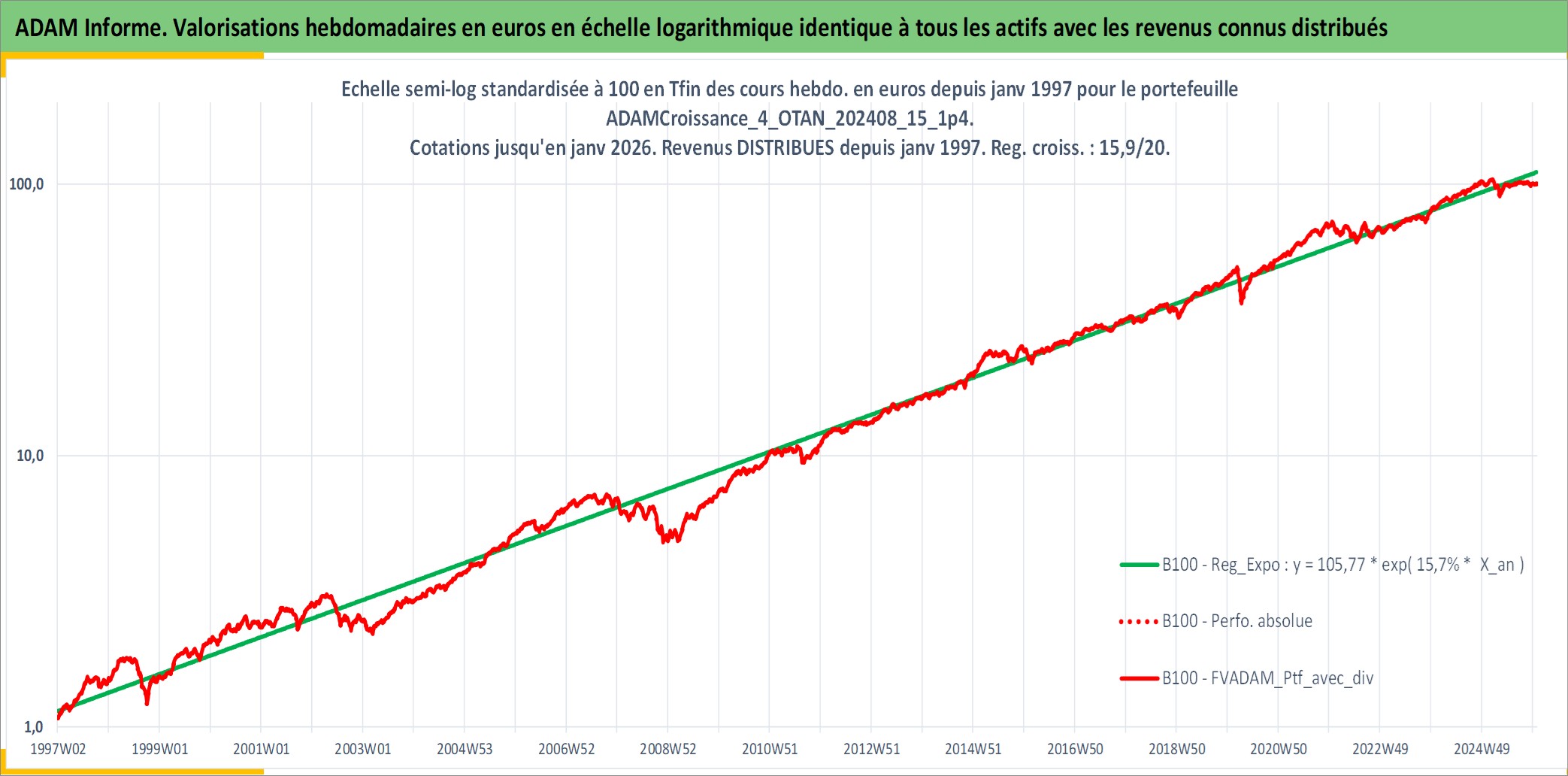 Site dédié aux investisseursPage dédiée sur site financeAnalyse des valorisations hebdomadaires du portefeuille ADAMCroissance_4_OTAN_202408_15_1p4_42actifs avec un profil P6_PurActions. Ce portefeuille est cote en EUR. Les valorisations couvrent les semaines 1997W01 a 2026W01. Les revenus de cet actif financier sont pris en compte depuis la semaine 1997W01. La note globale ESG de cet actif est estimee a 10.6 (apres rebasage entre 0 et 20).