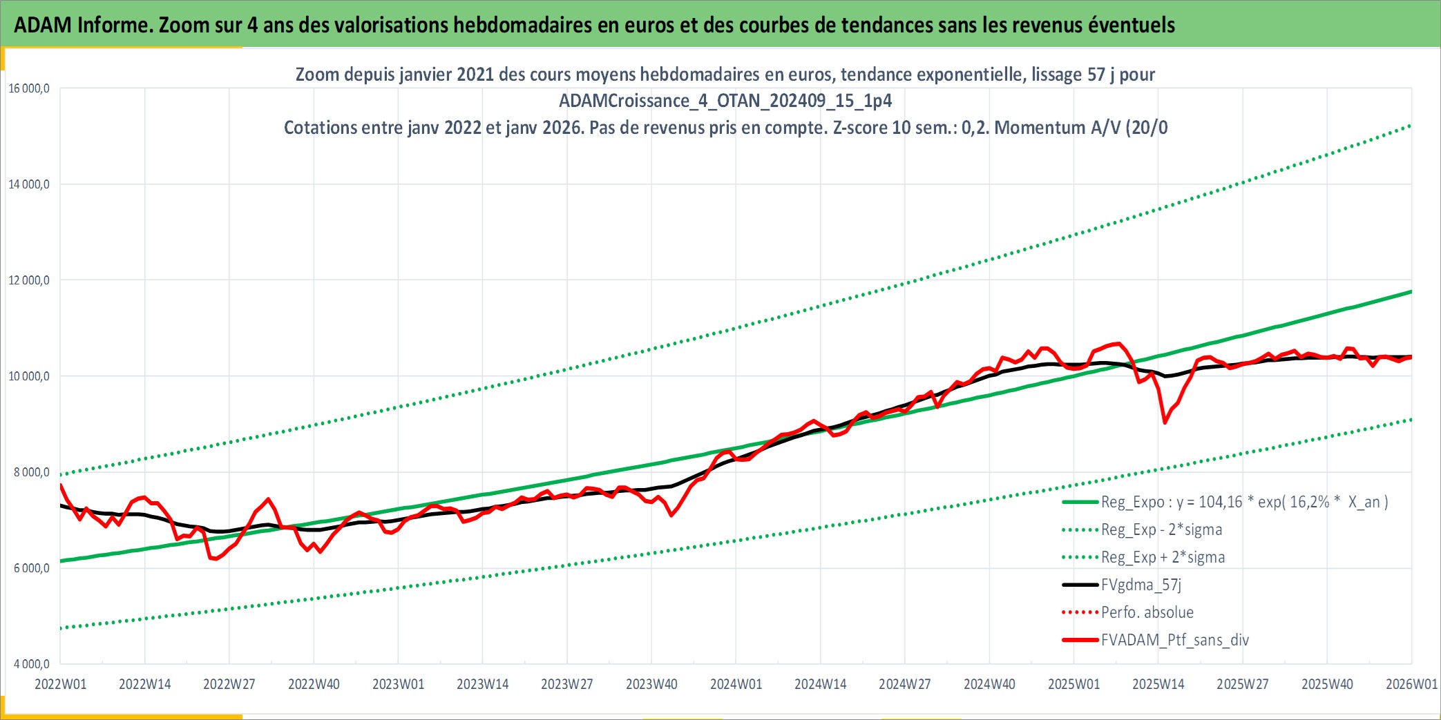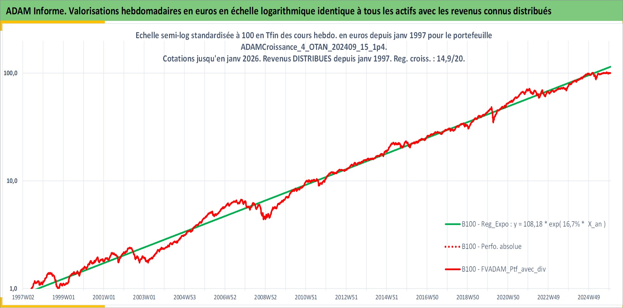 Site dédié aux investisseursPage dédiée sur site financeAnalyse des valorisations hebdomadaires du portefeuille ADAMCroissance_4_OTAN_202409_15_1p4_32actifs avec un profil P6_PurActions. Ce portefeuille est cote en EUR. Les valorisations couvrent les semaines 1997W01 a 2026W01. Les revenus de cet actif financier sont pris en compte depuis la semaine 1997W01. La note globale ESG de cet actif est estimee a 10.2 (apres rebasage entre 0 et 20).