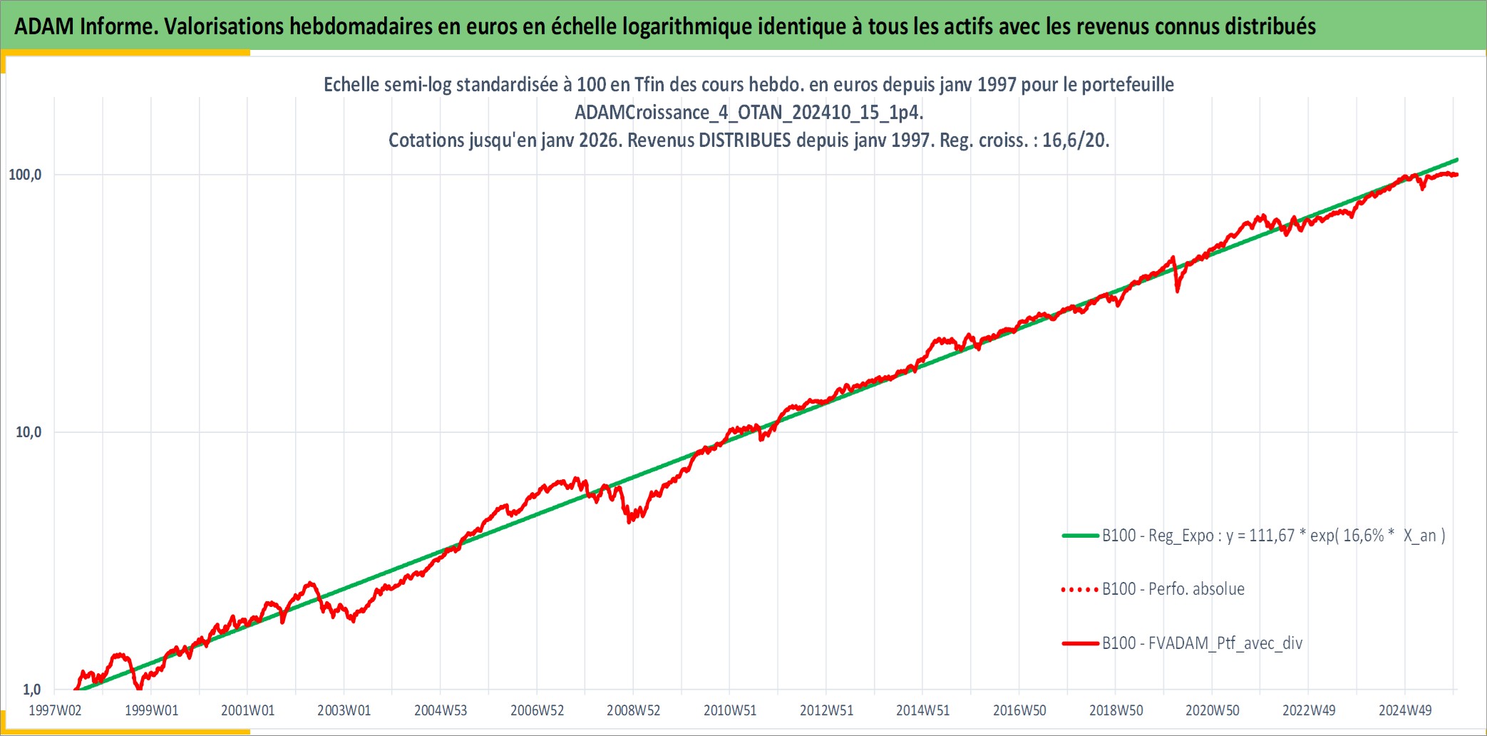 Site dédié aux investisseursPage dédiée sur site financeAnalyse des valorisations hebdomadaires du portefeuille ADAMCroissance_4_OTAN_202410_15_1p4_35actifs avec un profil P6_PurActions. Ce portefeuille est cote en EUR. Les valorisations couvrent les semaines 1997W01 a 2026W01. Les revenus de cet actif financier sont pris en compte depuis la semaine 1997W01. La note globale ESG de cet actif est estimee a 10.8 (apres rebasage entre 0 et 20).