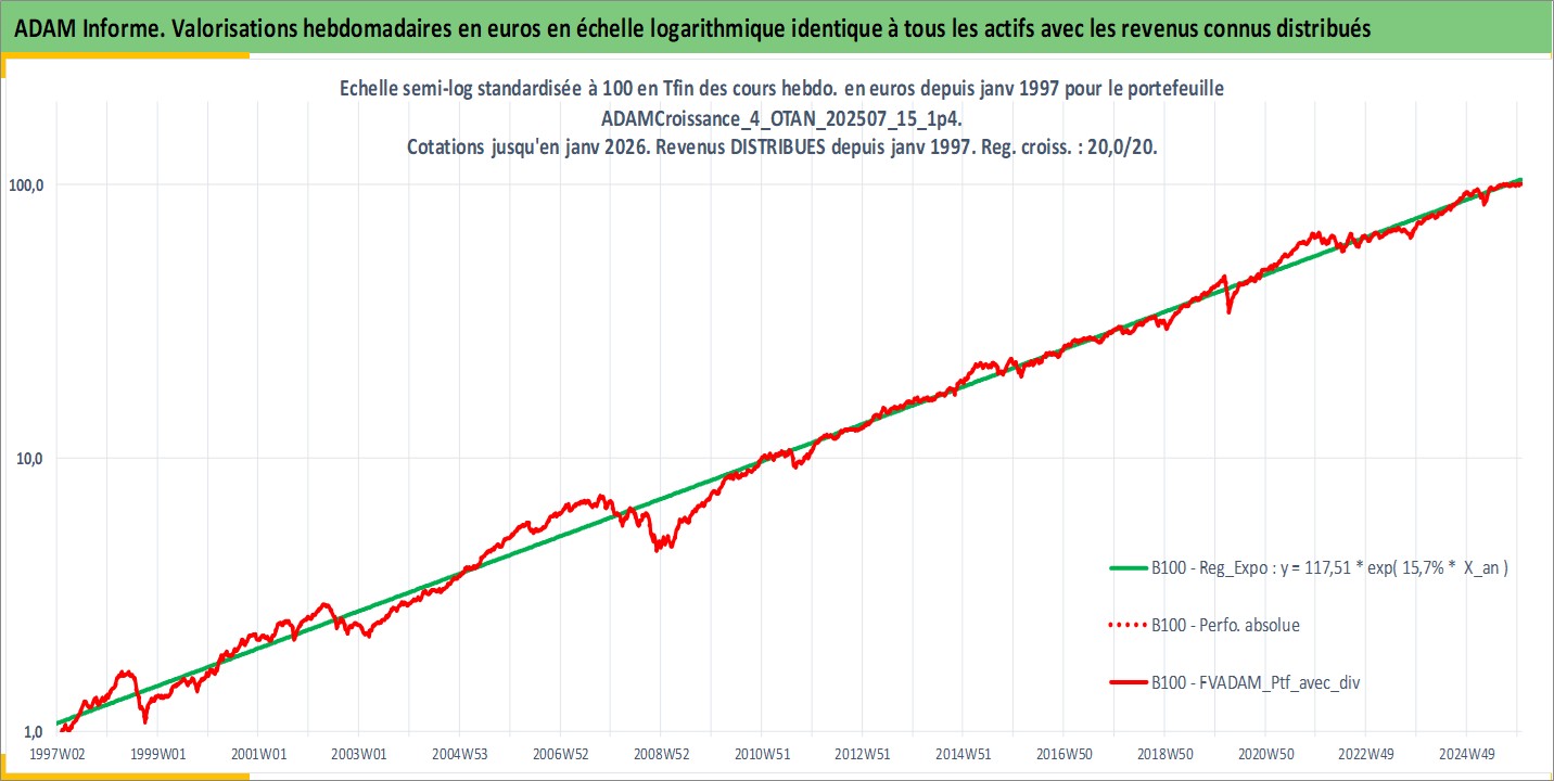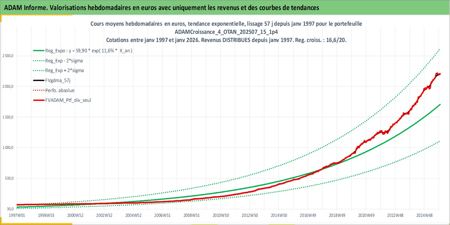 Site dédié aux investisseursPage dédiée sur site financeAnalyse des valorisations hebdomadaires du portefeuille ADAMCroissance_4_OTAN_202507_15_1p4_30actifs avec un profil P6_PurActions. Ce portefeuille est cote en EUR. Les valorisations couvrent les semaines 1997W01 a 2026W01. Les revenus de cet actif financier sont pris en compte depuis la semaine 1997W01. La note globale ESG de cet actif est estimee a 10.9 (apres rebasage entre 0 et 20).