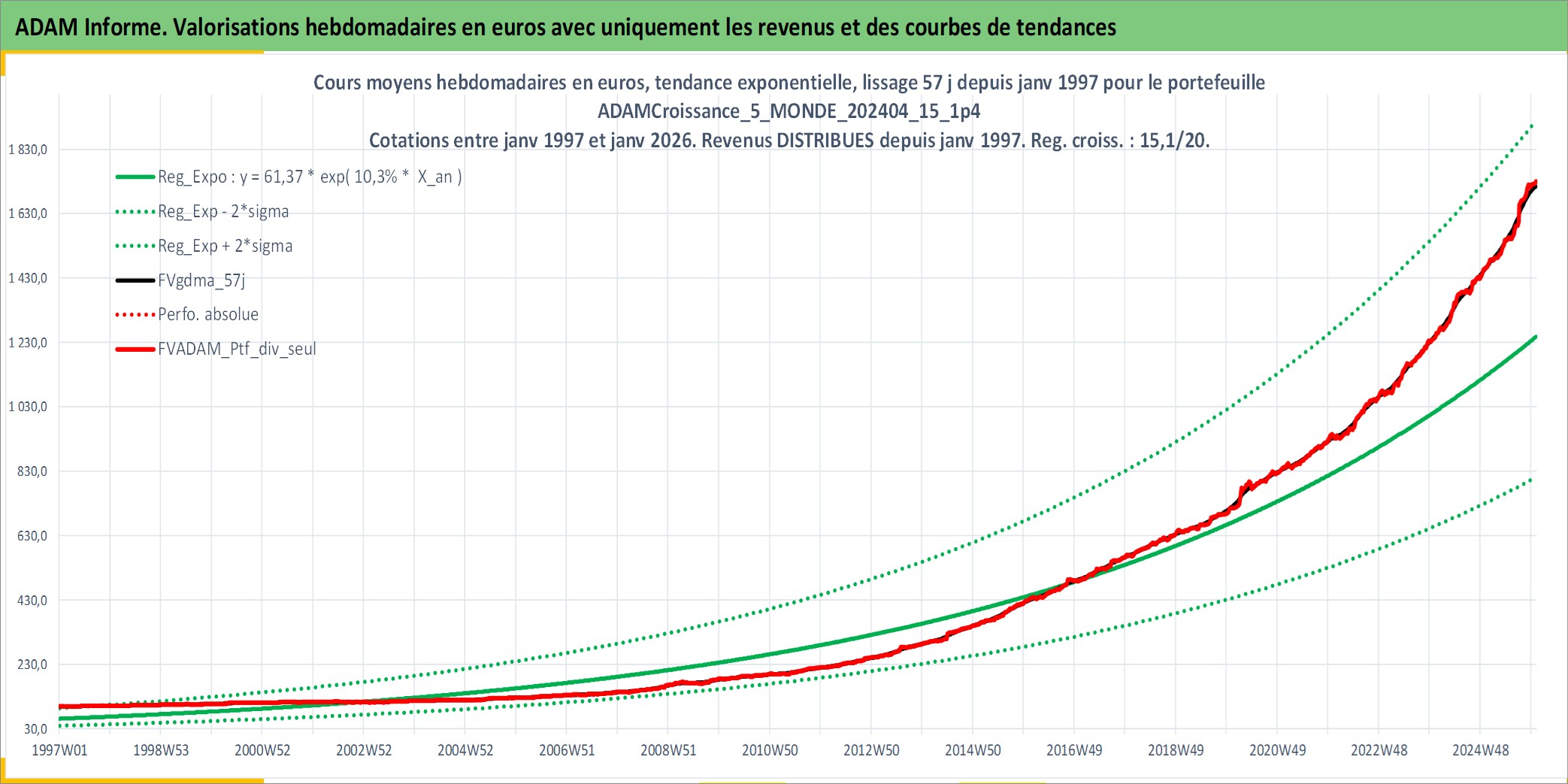 Site dédié aux investisseursPage dédiée sur site financeAnalyse des valorisations hebdomadaires du portefeuille ADAMCroissance_5_MONDE_202404_15_1p4_20actifs avec un profil P6_PurActions. Ce portefeuille est cote en EUR. Les valorisations couvrent les semaines 1997W01 a 2026W01. Les revenus de cet actif financier sont pris en compte depuis la semaine 1997W01. La note globale ESG de cet actif est estimee a 9.9 (apres rebasage entre 0 et 20).