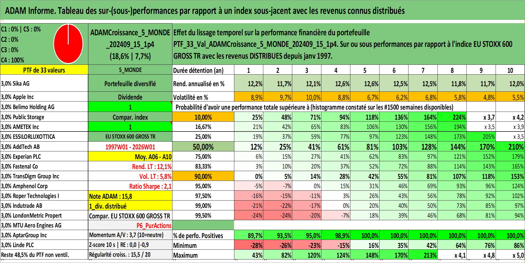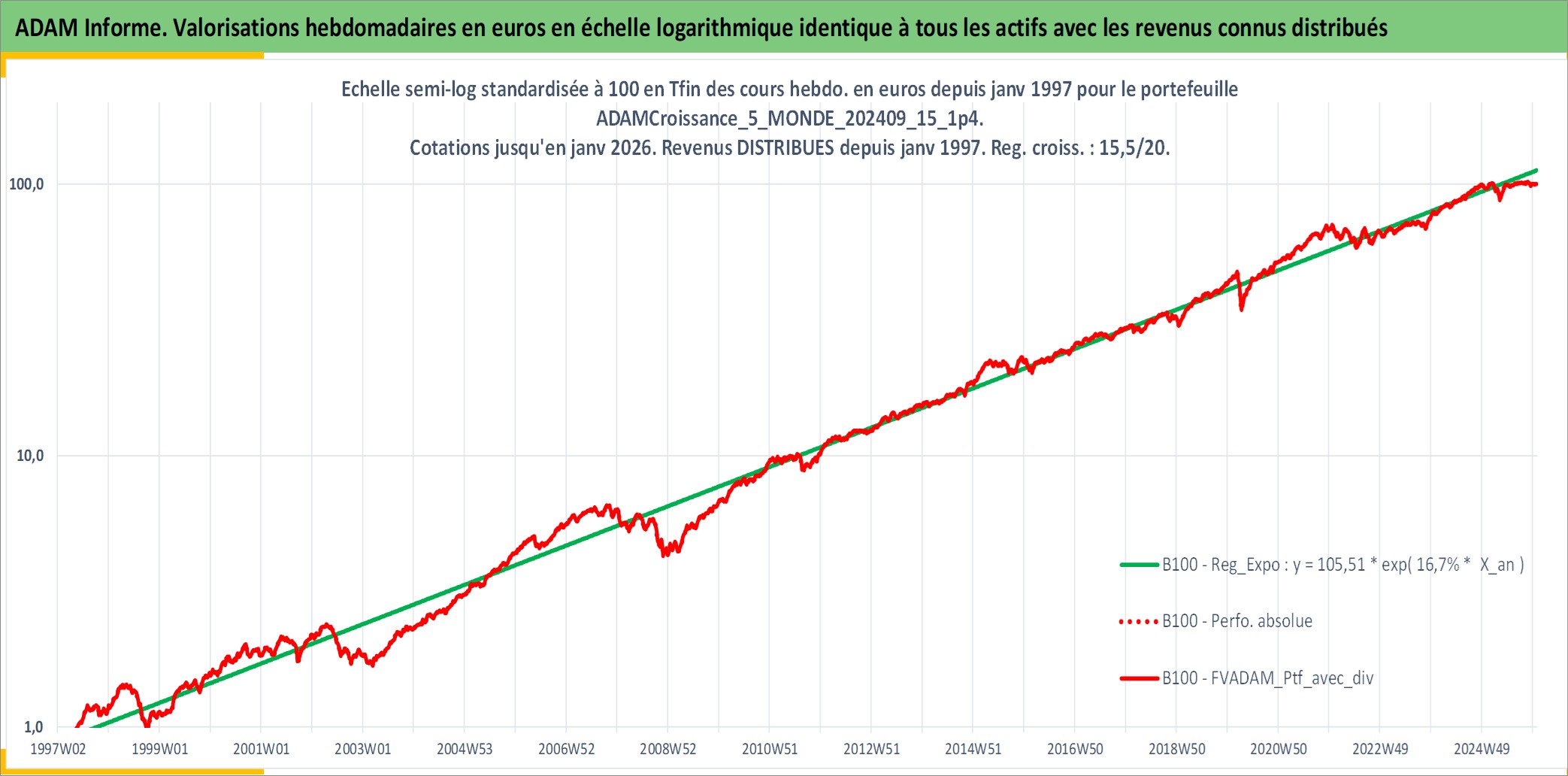 Site dédié aux investisseursPage dédiée sur site financeAnalyse des valorisations hebdomadaires du portefeuille ADAMCroissance_5_MONDE_202409_15_1p4_33actifs avec un profil P6_PurActions. Ce portefeuille est cote en EUR. Les valorisations couvrent les semaines 1997W01 a 2026W01. Les revenus de cet actif financier sont pris en compte depuis la semaine 1997W01. La note globale ESG de cet actif est estimee a 10.2 (apres rebasage entre 0 et 20).