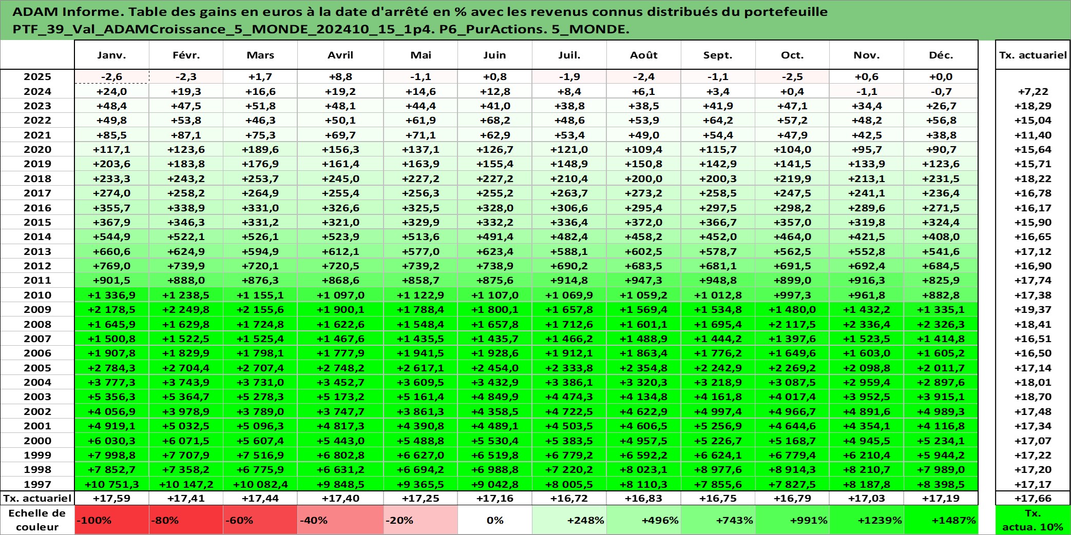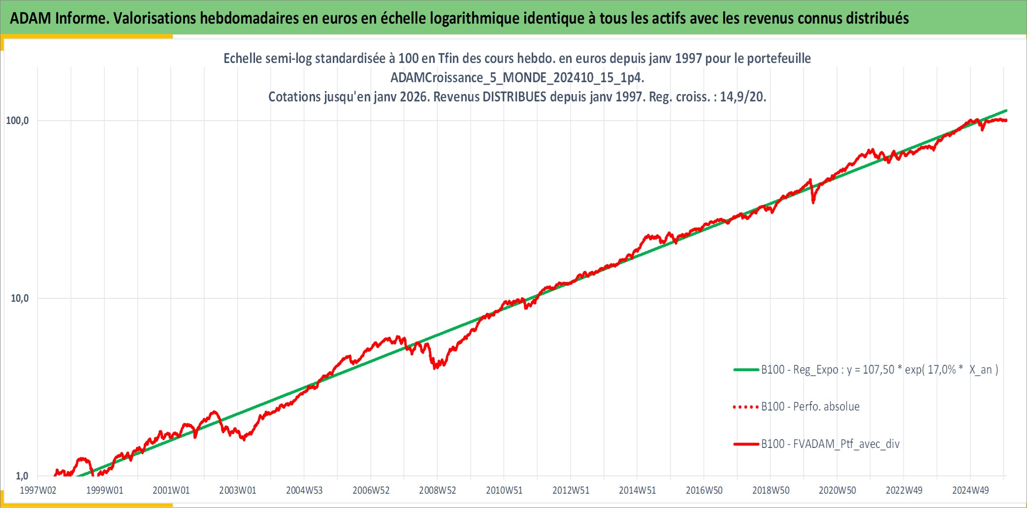 Site dédié aux investisseursPage dédiée sur site financeAnalyse des valorisations hebdomadaires du portefeuille ADAMCroissance_5_MONDE_202410_15_1p4_39actifs avec un profil P6_PurActions. Ce portefeuille est cote en EUR. Les valorisations couvrent les semaines 1997W01 a 2026W01. Les revenus de cet actif financier sont pris en compte depuis la semaine 1997W01. La note globale ESG de cet actif est estimee a 11.0 (apres rebasage entre 0 et 20).