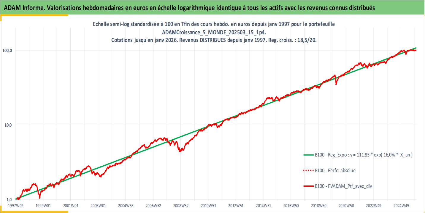 Site dédié aux investisseursPage dédiée sur site financeAnalyse des valorisations hebdomadaires du portefeuille ADAMCroissance_5_MONDE_202503_15_1p4_35actifs avec un profil P6_PurActions. Ce portefeuille est cote en EUR. Les valorisations couvrent les semaines 1997W01 a 2026W01. Les revenus de cet actif financier sont pris en compte depuis la semaine 1997W01. La note globale ESG de cet actif est estimee a 10.9 (apres rebasage entre 0 et 20).