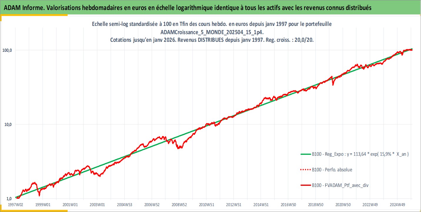 Site dédié aux investisseursPage dédiée sur site financeAnalyse des valorisations hebdomadaires du portefeuille ADAMCroissance_5_MONDE_202504_15_1p4_25actifs avec un profil P6_PurActions. Ce portefeuille est cote en EUR. Les valorisations couvrent les semaines 1997W01 a 2026W01. Les revenus de cet actif financier sont pris en compte depuis la semaine 1997W01. La note globale ESG de cet actif est estimee a 11.7 (apres rebasage entre 0 et 20).