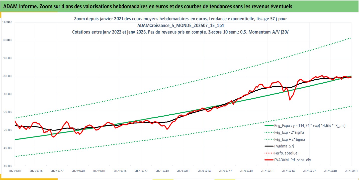 Site dédié aux investisseursPage dédiée sur site financeAnalyse des valorisations hebdomadaires du portefeuille ADAMCroissance_5_MONDE_202507_15_1p4_31actifs avec un profil P6_PurActions. Ce portefeuille est cote en EUR. Les valorisations couvrent les semaines 1997W01 a 2026W01. Les revenus de cet actif financier sont pris en compte depuis la semaine 1997W01. La note globale ESG de cet actif est estimee a 11.0 (apres rebasage entre 0 et 20).