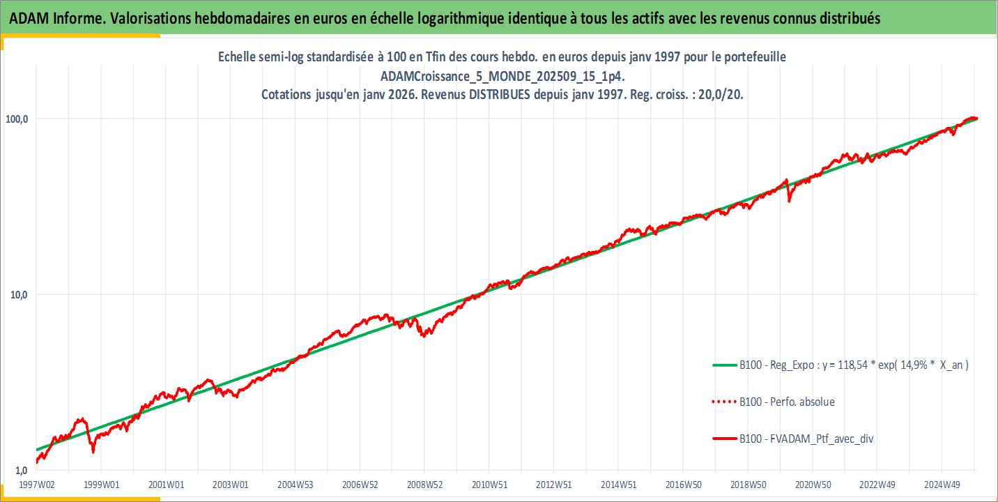 Site dédié aux investisseursPage dédiée sur site financeAnalyse des valorisations hebdomadaires du portefeuille ADAMCroissance_5_MONDE_202509_15_1p4_20actifs avec un profil P6_PurActions. Ce portefeuille est cote en EUR. Les valorisations couvrent les semaines 1997W01 a 2026W01. Les revenus de cet actif financier sont pris en compte depuis la semaine 1997W01. La note globale ESG de cet actif est estimee a 12.2 (apres rebasage entre 0 et 20).