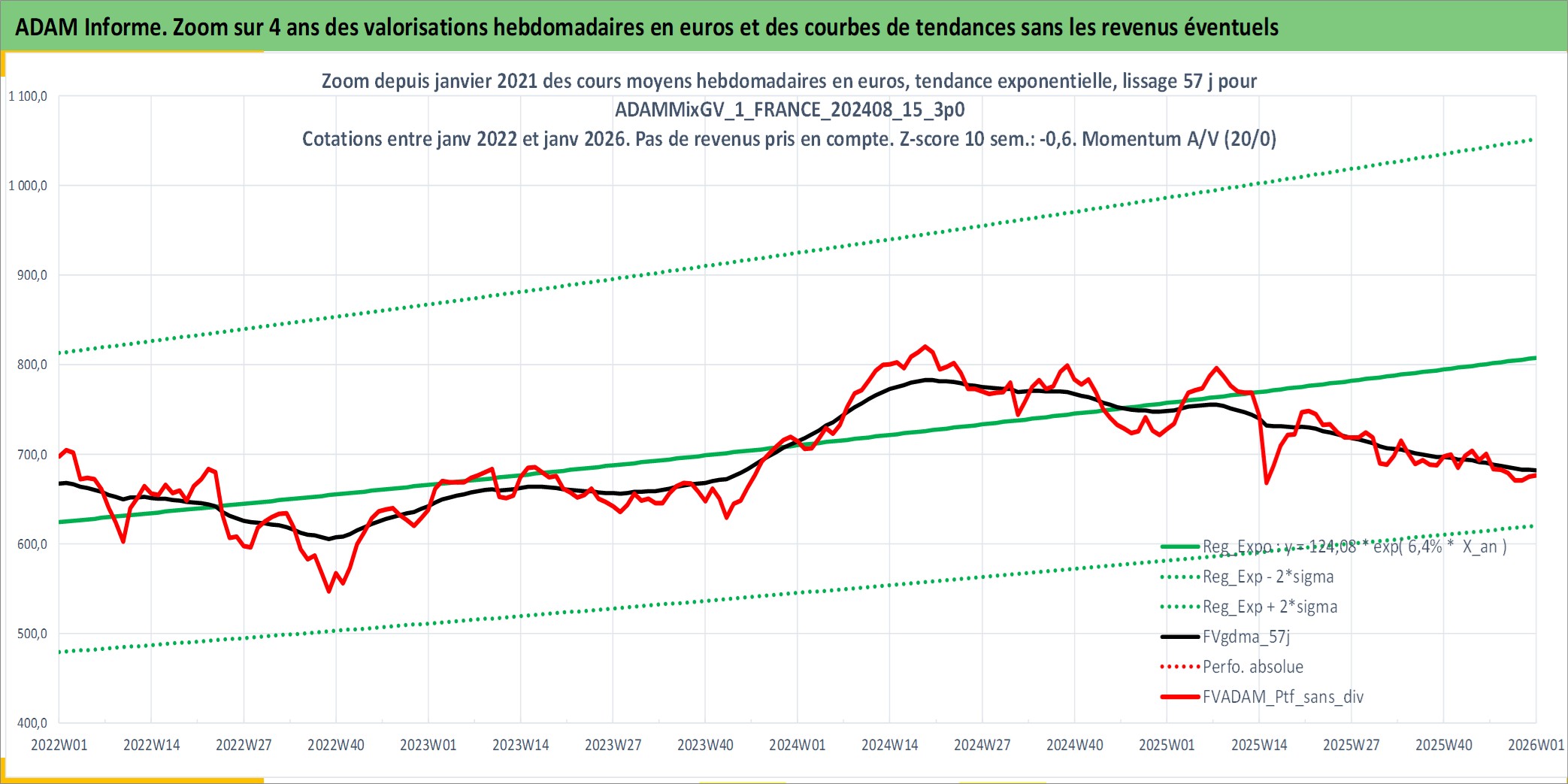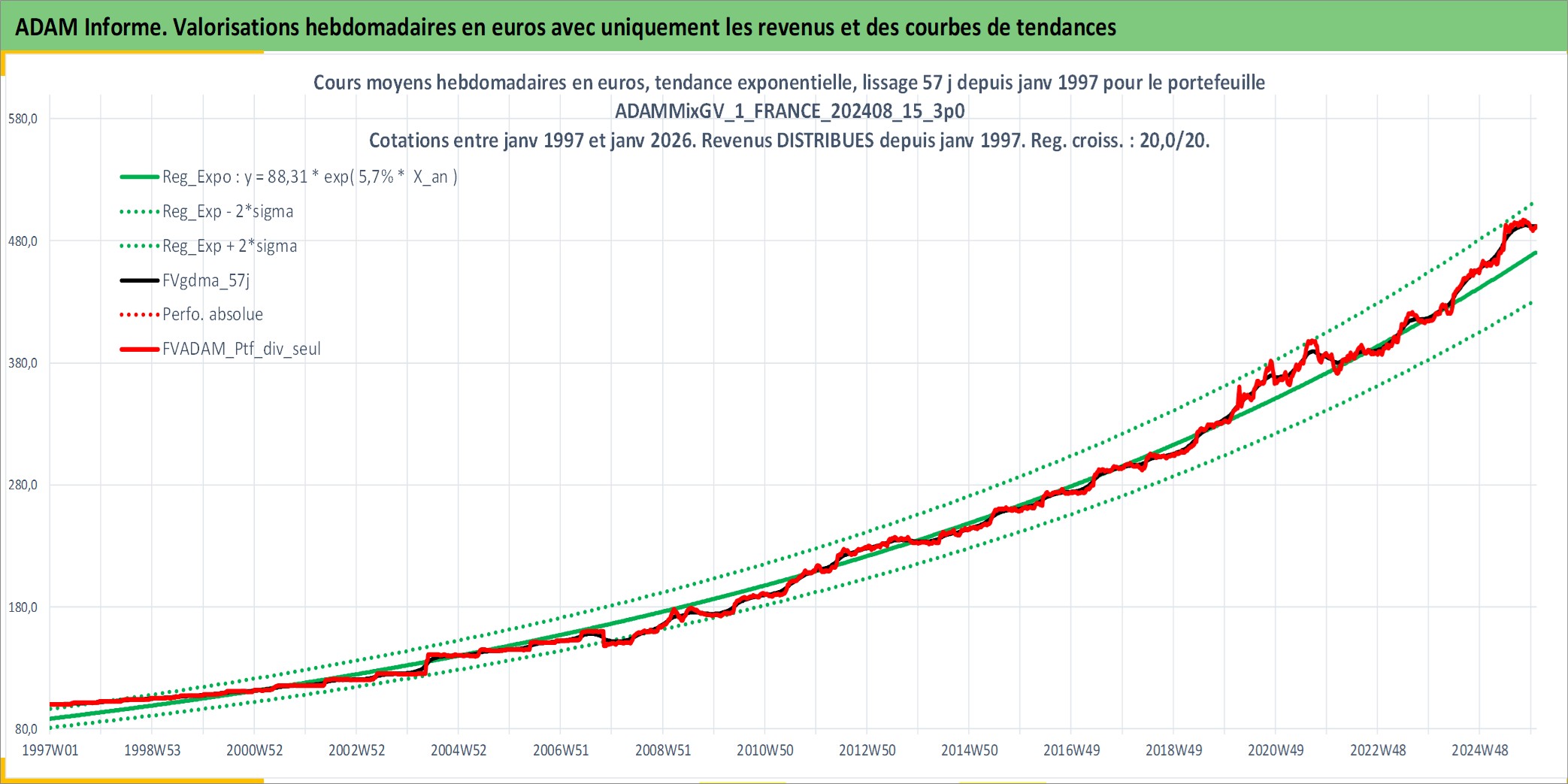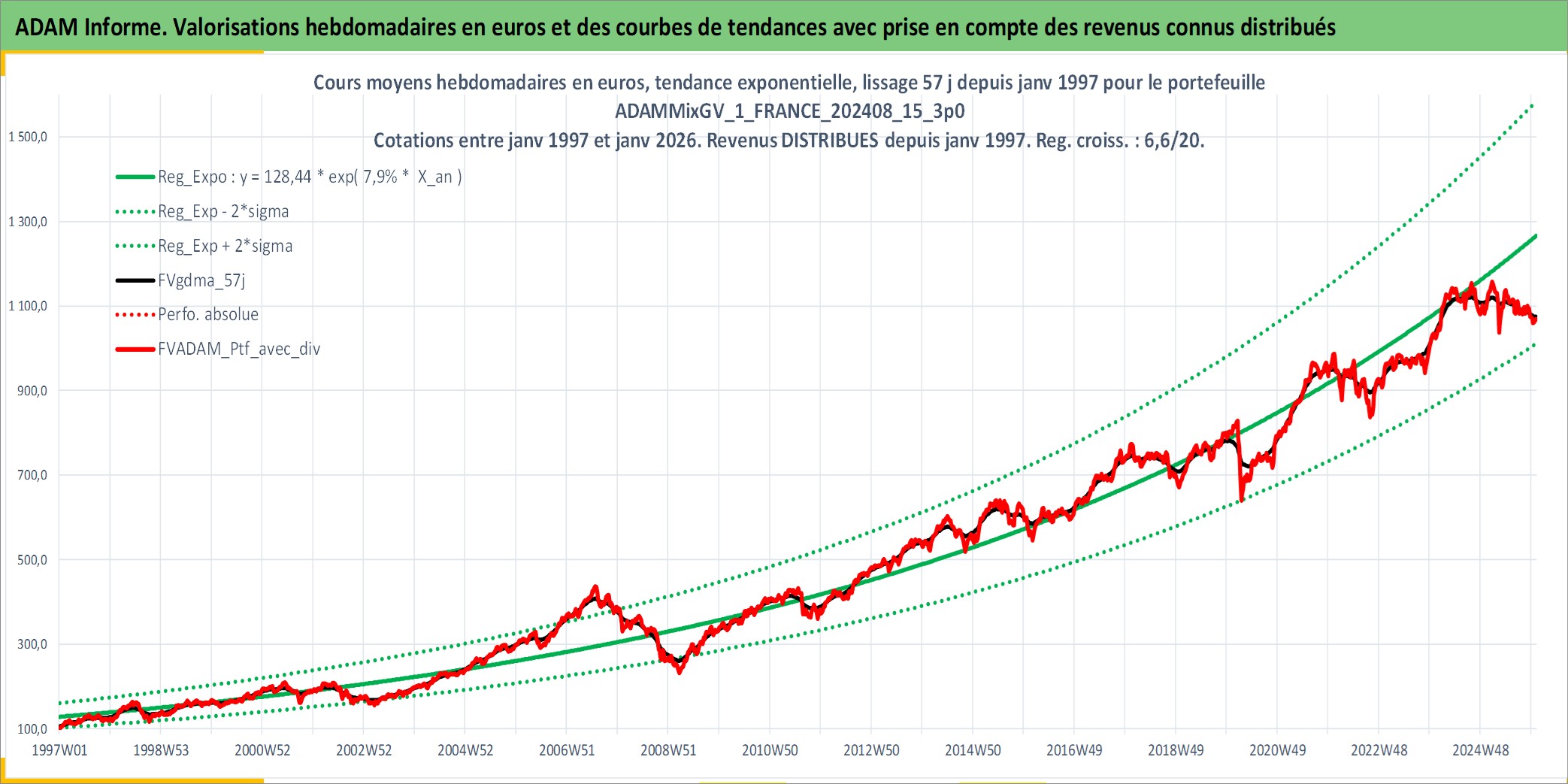 Site dédié aux investisseursPage dédiée sur site financeAnalyse des valorisations hebdomadaires du portefeuille ADAMMixGV_1_FRANCE_202408_15_3p0_5actifs avec un profil P6_PurActions. Ce portefeuille est cote en EUR. Les valorisations couvrent les semaines 1997W01 a 2026W01. Les revenus de cet actif financier sont pris en compte depuis la semaine 1997W01. La note globale ESG de cet actif est estimee a 12.7 (apres rebasage entre 0 et 20).