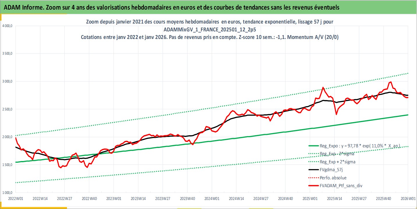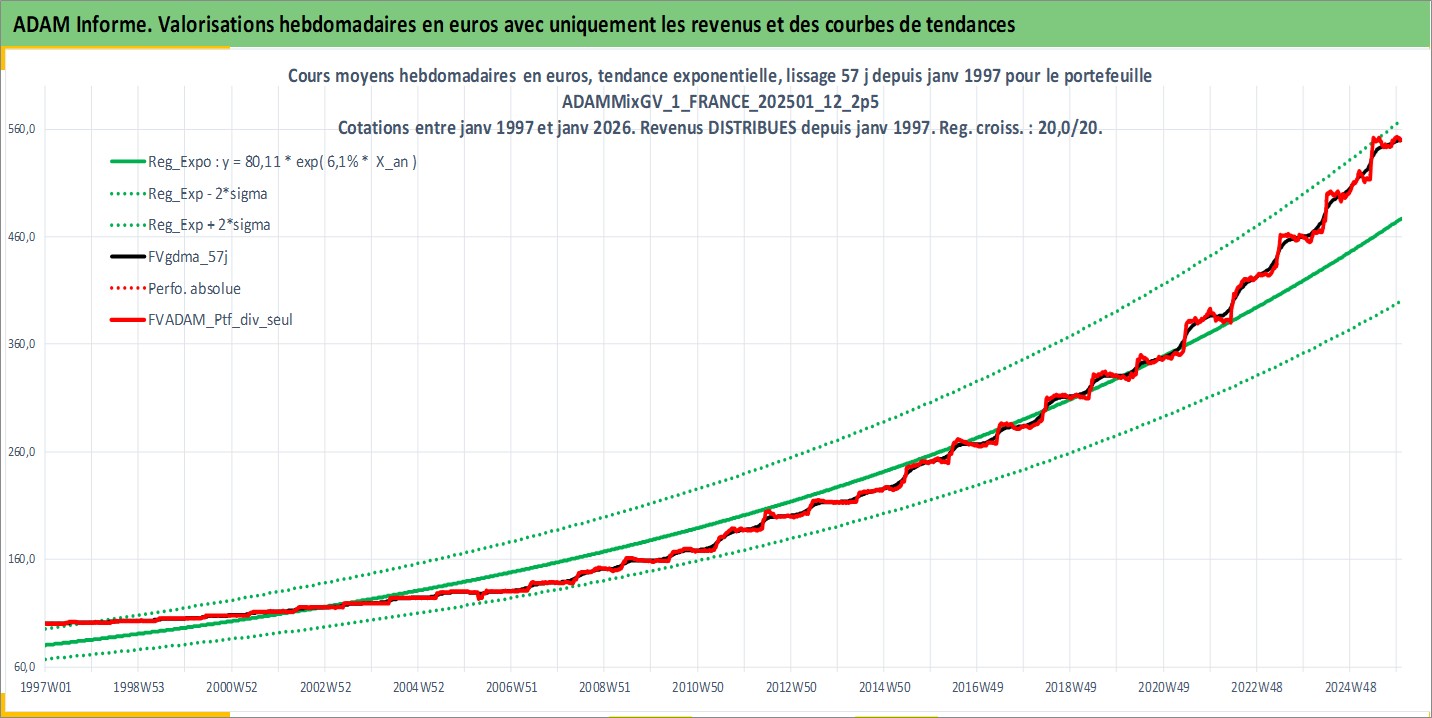 Site dédié aux investisseursPage dédiée sur site financeAnalyse des valorisations hebdomadaires du portefeuille ADAMMixGV_1_FRANCE_202501_12_2p5_5actifs avec un profil P6_PurActions. Ce portefeuille est cote en EUR. Les valorisations couvrent les semaines 1997W01 a 2026W01. Les revenus de cet actif financier sont pris en compte depuis la semaine 1997W01. La note globale ESG de cet actif est estimee a 13.2 (apres rebasage entre 0 et 20).
