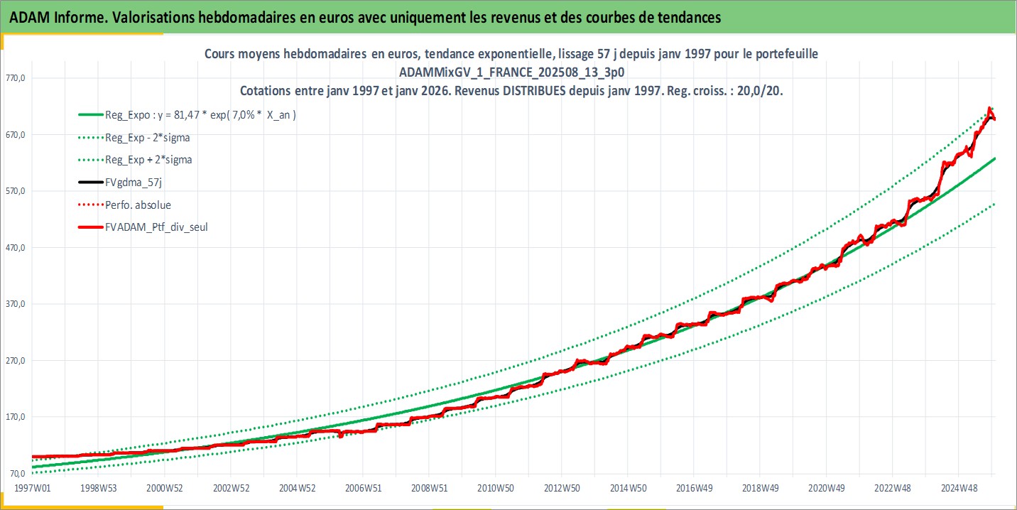 Site dédié aux investisseursPage dédiée sur site financeAnalyse des valorisations hebdomadaires du portefeuille ADAMMixGV_1_FRANCE_202508_13_3p0_4actifs avec un profil P6_PurActions. Ce portefeuille est cote en EUR. Les valorisations couvrent les semaines 1997W01 a 2026W01. Les revenus de cet actif financier sont pris en compte depuis la semaine 1997W01. La note globale ESG de cet actif est estimee a 11.0 (apres rebasage entre 0 et 20).
