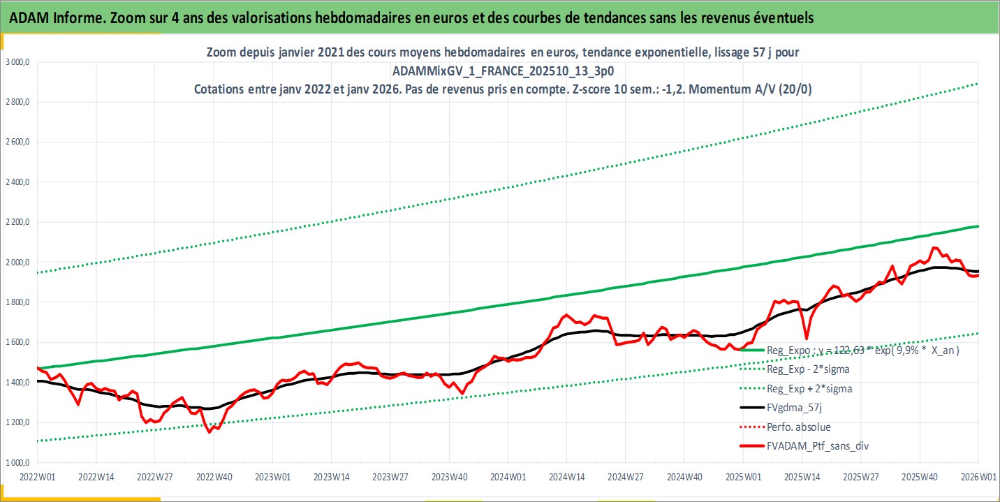 Site dédié aux investisseursPage dédiée sur site financeAnalyse des valorisations hebdomadaires du portefeuille ADAMMixGV_1_FRANCE_202510_13_3p0_5actifs avec un profil P6_PurActions. Ce portefeuille est cote en EUR. Les valorisations couvrent les semaines 1997W01 a 2026W01. Les revenus de cet actif financier sont pris en compte depuis la semaine 1997W01. La note globale ESG de cet actif est estimee a 11.0 (apres rebasage entre 0 et 20).