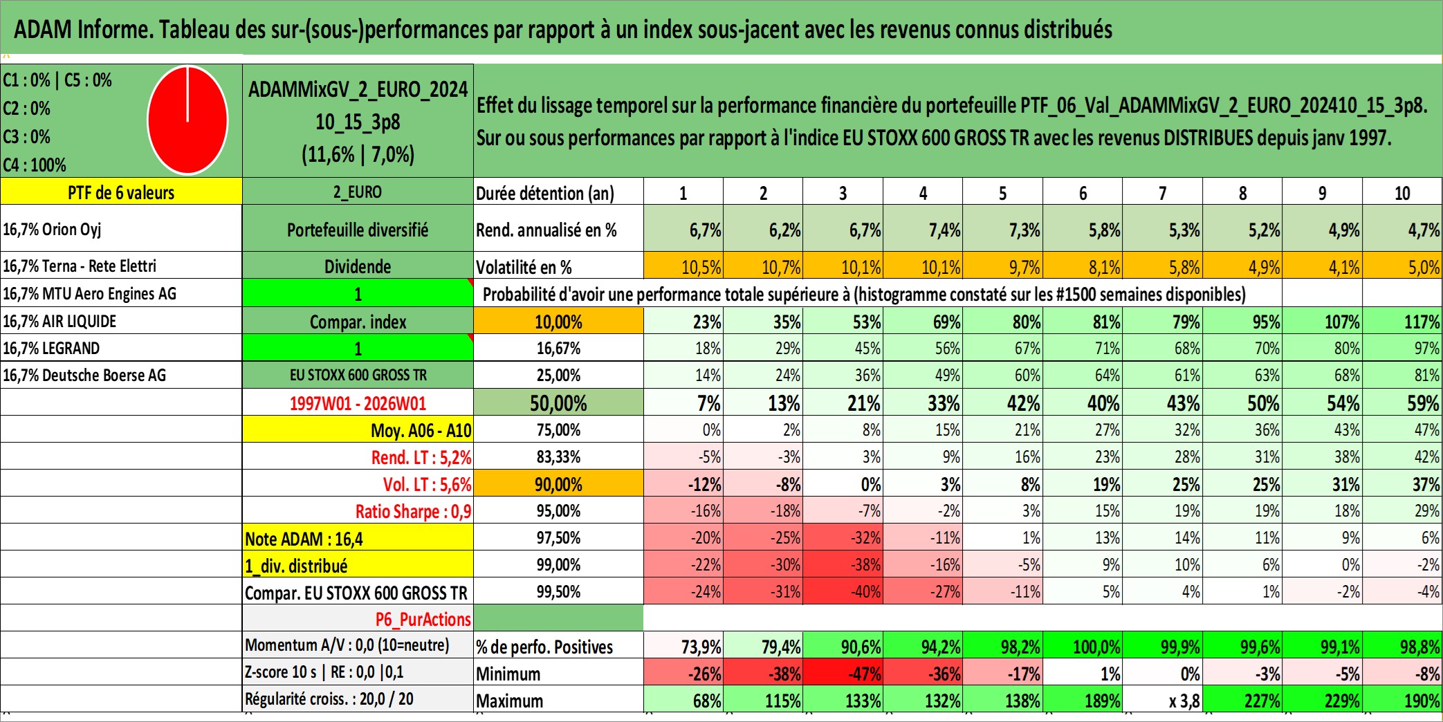 Site dédié aux investisseursPage dédiée sur site financeAnalyse des valorisations hebdomadaires du portefeuille ADAMMixGV_2_EURO_202410_15_3p8_6actifs avec un profil P6_PurActions. Ce portefeuille est cote en EUR. Les valorisations couvrent les semaines 1997W01 a 2026W01. Les revenus de cet actif financier sont pris en compte depuis la semaine 1997W01. La note globale ESG de cet actif est estimee a 12.5 (apres rebasage entre 0 et 20).