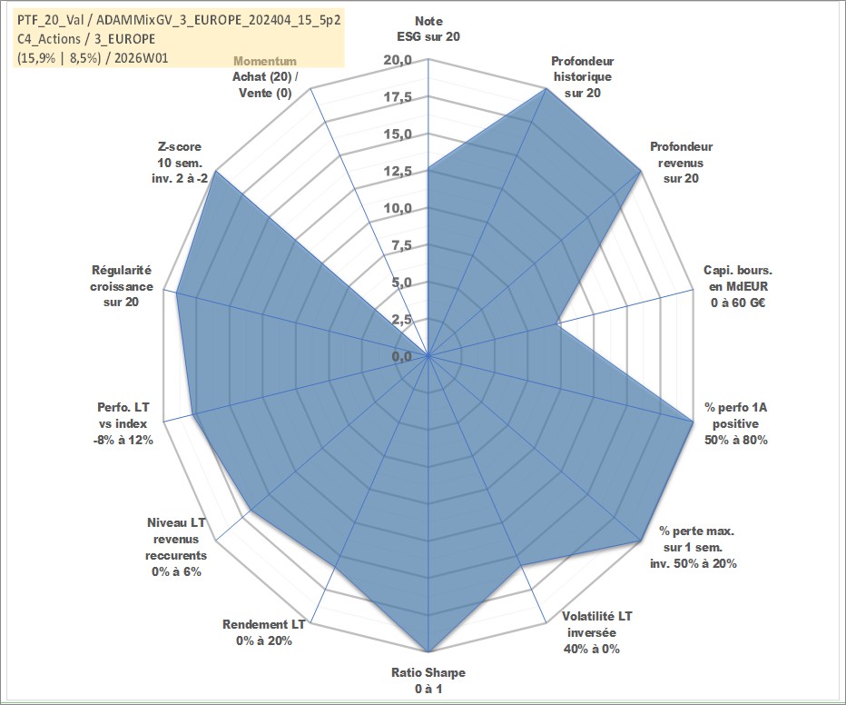 Site dédié aux investisseursPage dédiée sur site financeAnalyse des valorisations hebdomadaires du portefeuille ADAMMixGV_3_EUROPE_202404_15_5p2_20actifs avec un profil P6_PurActions. Ce portefeuille est cote en EUR. Les valorisations couvrent les semaines 1997W01 a 2026W01. Les revenus de cet actif financier sont pris en compte depuis la semaine 1997W01. La note globale ESG de cet actif est estimee a 12.7 (apres rebasage entre 0 et 20).