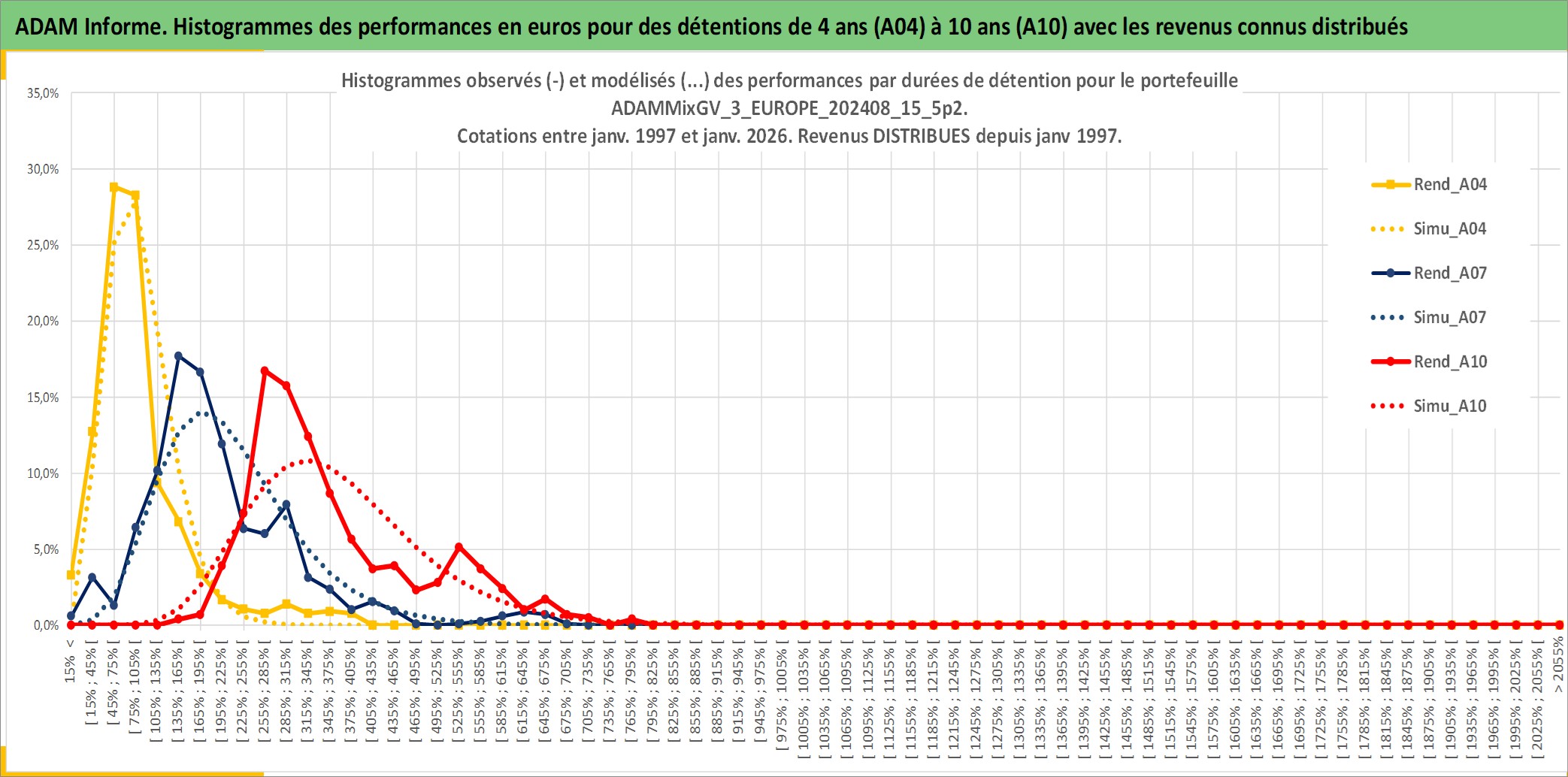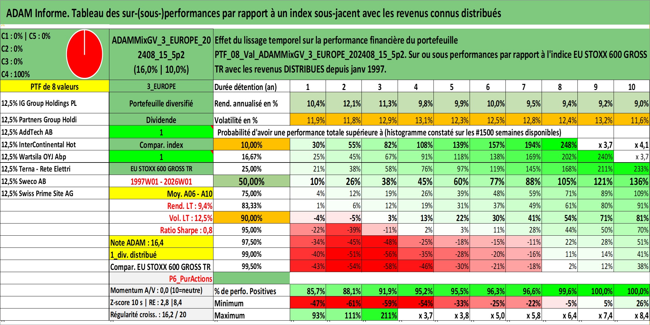 Site dédié aux investisseursPage dédiée sur site financeAnalyse des valorisations hebdomadaires du portefeuille ADAMMixGV_3_EUROPE_202408_15_5p2_8actifs avec un profil P6_PurActions. Ce portefeuille est cote en EUR. Les valorisations couvrent les semaines 1997W01 a 2026W01. Les revenus de cet actif financier sont pris en compte depuis la semaine 1997W01. La note globale ESG de cet actif est estimee a 13.0 (apres rebasage entre 0 et 20).