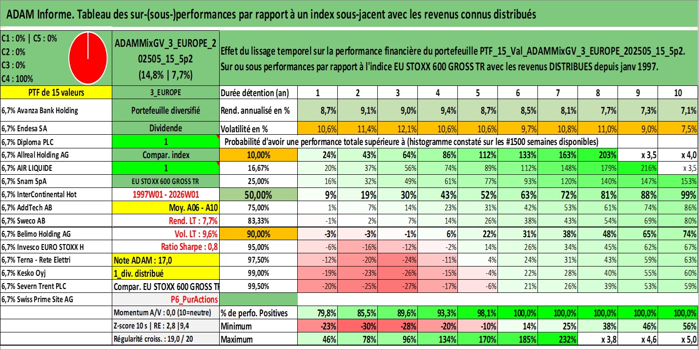 Site dédié aux investisseursPage dédiée sur site financeAnalyse des valorisations hebdomadaires du portefeuille ADAMMixGV_3_EUROPE_202505_15_5p2_15actifs avec un profil P6_PurActions. Ce portefeuille est cote en EUR. Les valorisations couvrent les semaines 1997W01 a 2026W01. Les revenus de cet actif financier sont pris en compte depuis la semaine 1997W01. La note globale ESG de cet actif est estimee a 13.7 (apres rebasage entre 0 et 20).
