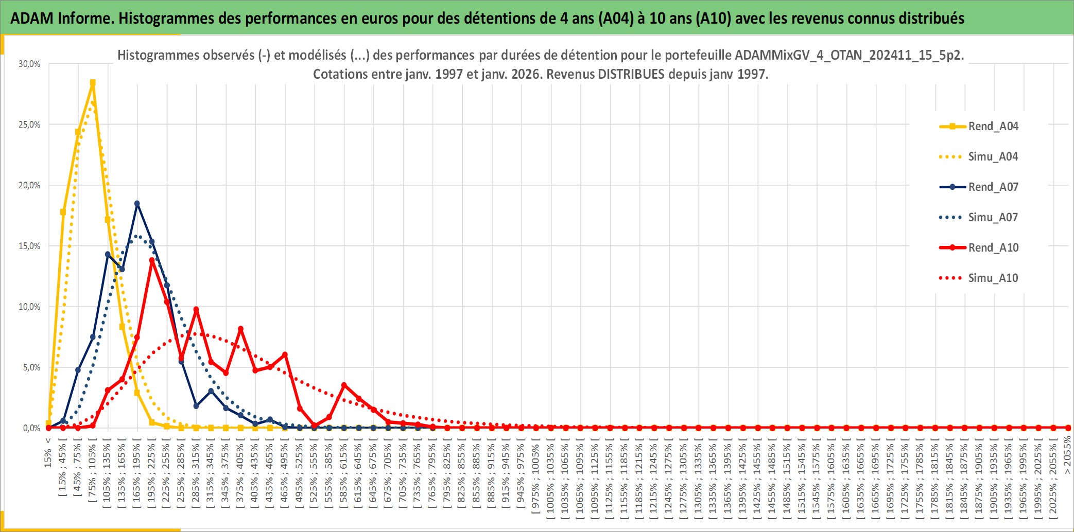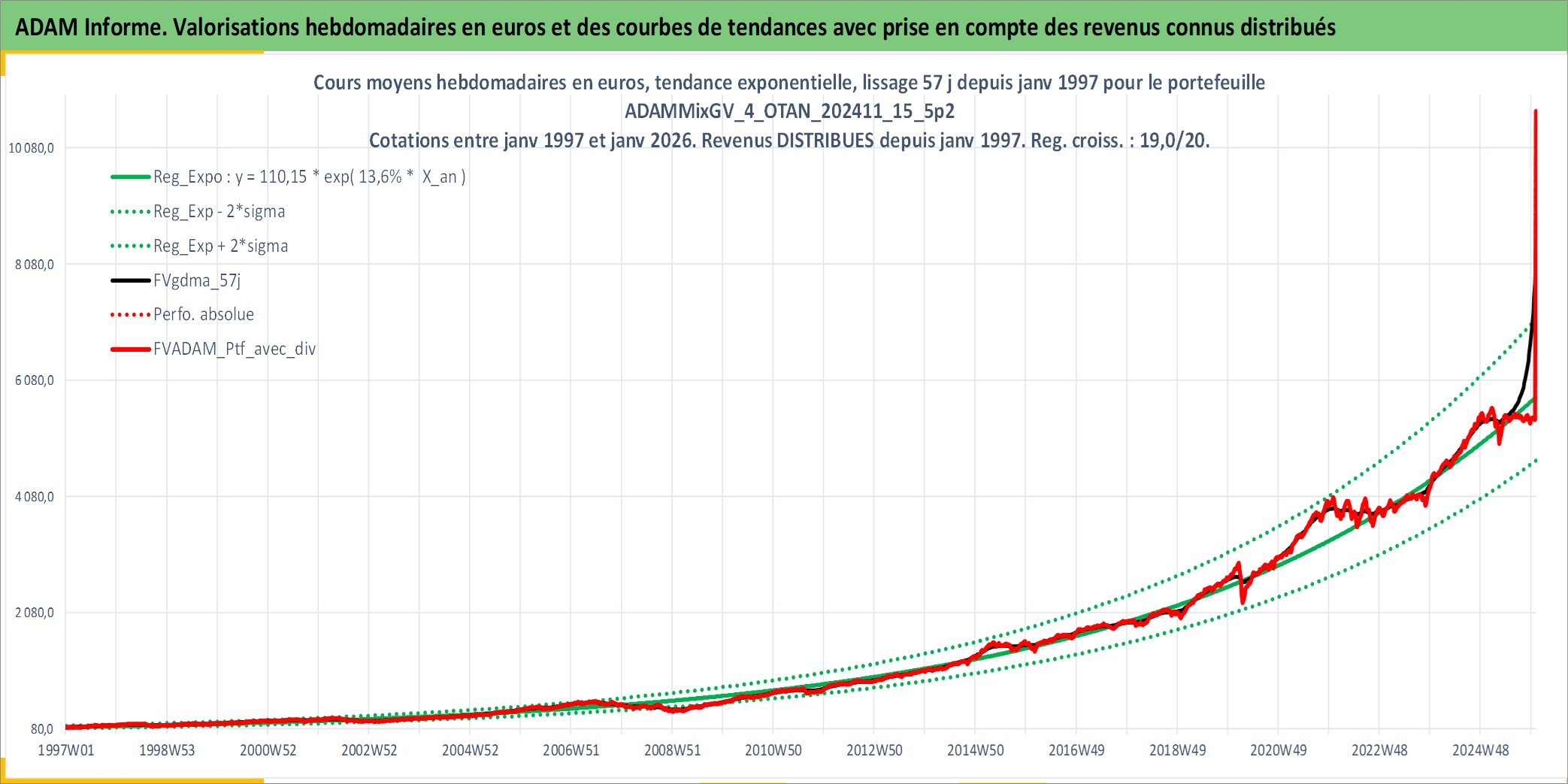 Site dédié aux investisseursPage dédiée sur site financeAnalyse des valorisations hebdomadaires du portefeuille ADAMMixGV_4_OTAN_202411_15_5p2_31actifs avec un profil P6_PurActions. Ce portefeuille est cote en EUR. Les valorisations couvrent les semaines 1997W01 a 2026W01. Les revenus de cet actif financier sont pris en compte depuis la semaine 1997W01. La note globale ESG de cet actif est estimee a 12.1 (apres rebasage entre 0 et 20).