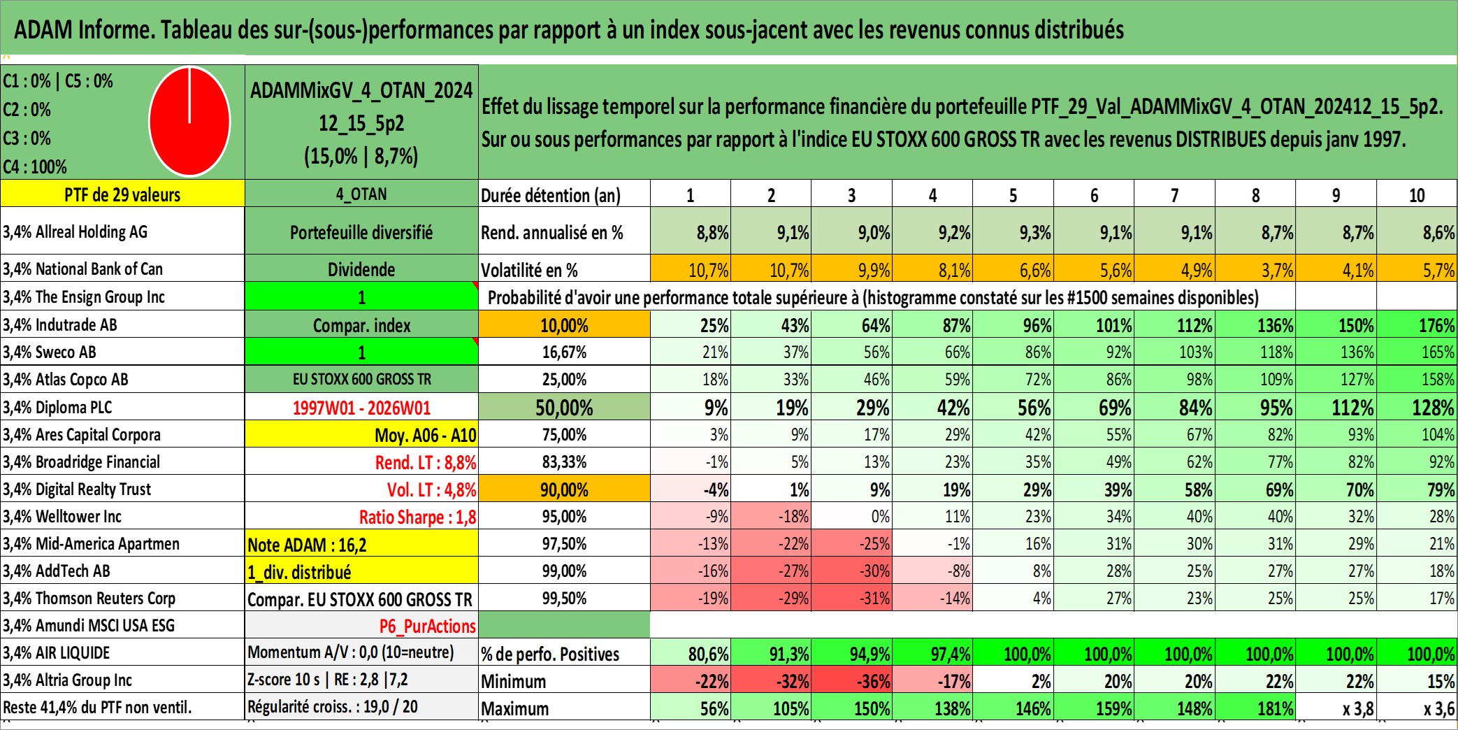 Site dédié aux investisseursPage dédiée sur site financeAnalyse des valorisations hebdomadaires du portefeuille ADAMMixGV_4_OTAN_202412_15_5p2_29actifs avec un profil P6_PurActions. Ce portefeuille est cote en EUR. Les valorisations couvrent les semaines 1997W01 a 2026W01. Les revenus de cet actif financier sont pris en compte depuis la semaine 1997W01. La note globale ESG de cet actif est estimee a 12.1 (apres rebasage entre 0 et 20).