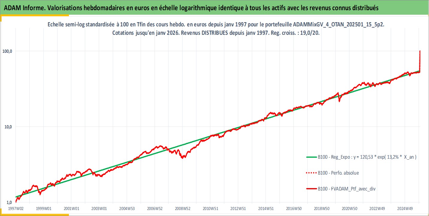 Site dédié aux investisseursPage dédiée sur site financeAnalyse des valorisations hebdomadaires du portefeuille ADAMMixGV_4_OTAN_202501_15_5p2_33actifs avec un profil P6_PurActions. Ce portefeuille est cote en EUR. Les valorisations couvrent les semaines 1997W01 a 2026W01. Les revenus de cet actif financier sont pris en compte depuis la semaine 1997W01. La note globale ESG de cet actif est estimee a 11.4 (apres rebasage entre 0 et 20).