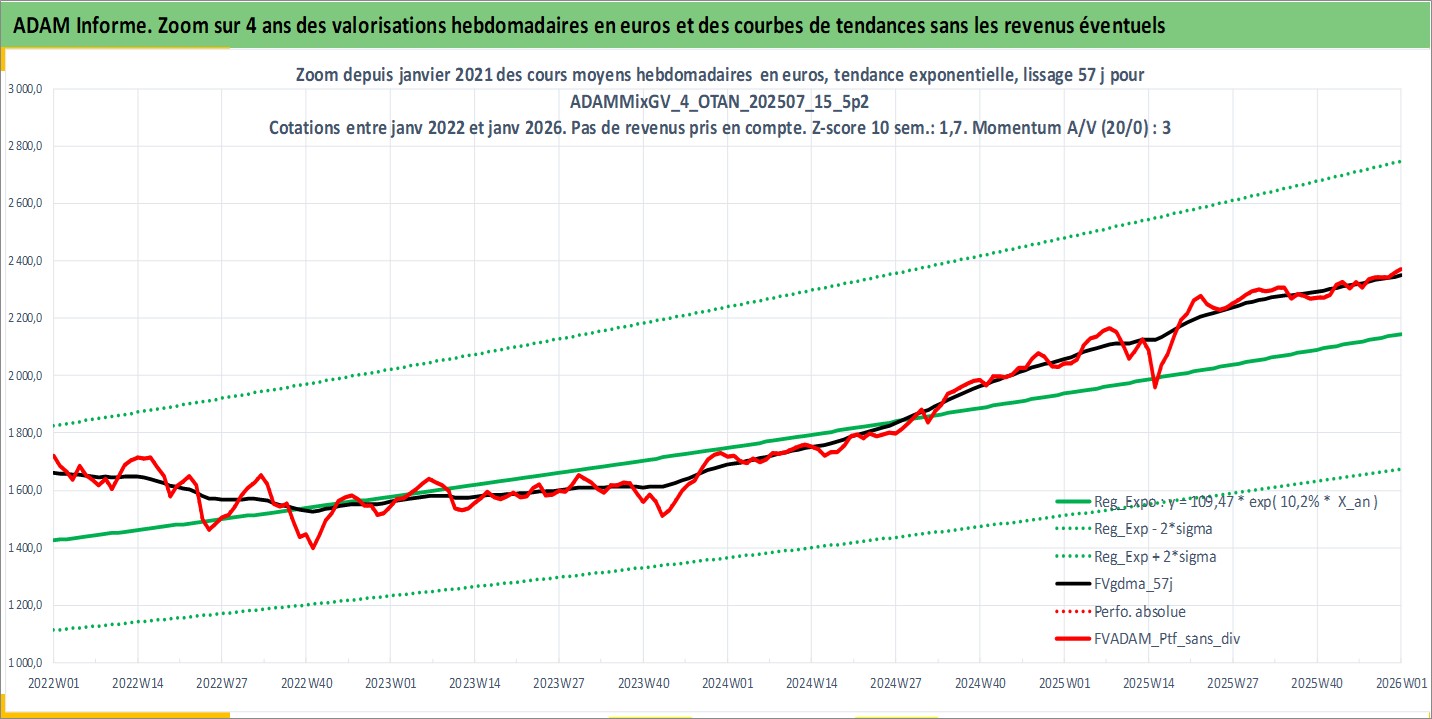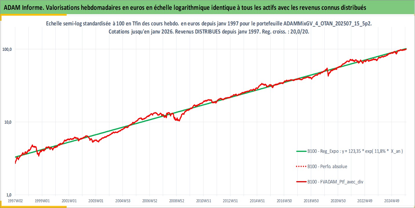 Site dédié aux investisseursPage dédiée sur site financeAnalyse des valorisations hebdomadaires du portefeuille ADAMMixGV_4_OTAN_202507_15_5p2_24actifs avec un profil P6_PurActions. Ce portefeuille est cote en EUR. Les valorisations couvrent les semaines 1997W01 a 2026W01. Les revenus de cet actif financier sont pris en compte depuis la semaine 1997W01. La note globale ESG de cet actif est estimee a 11.5 (apres rebasage entre 0 et 20).