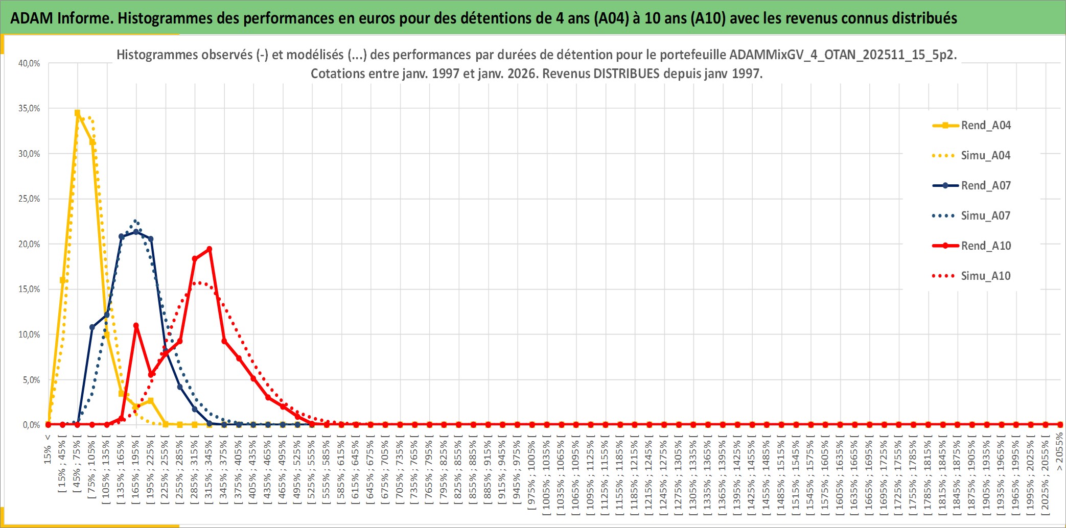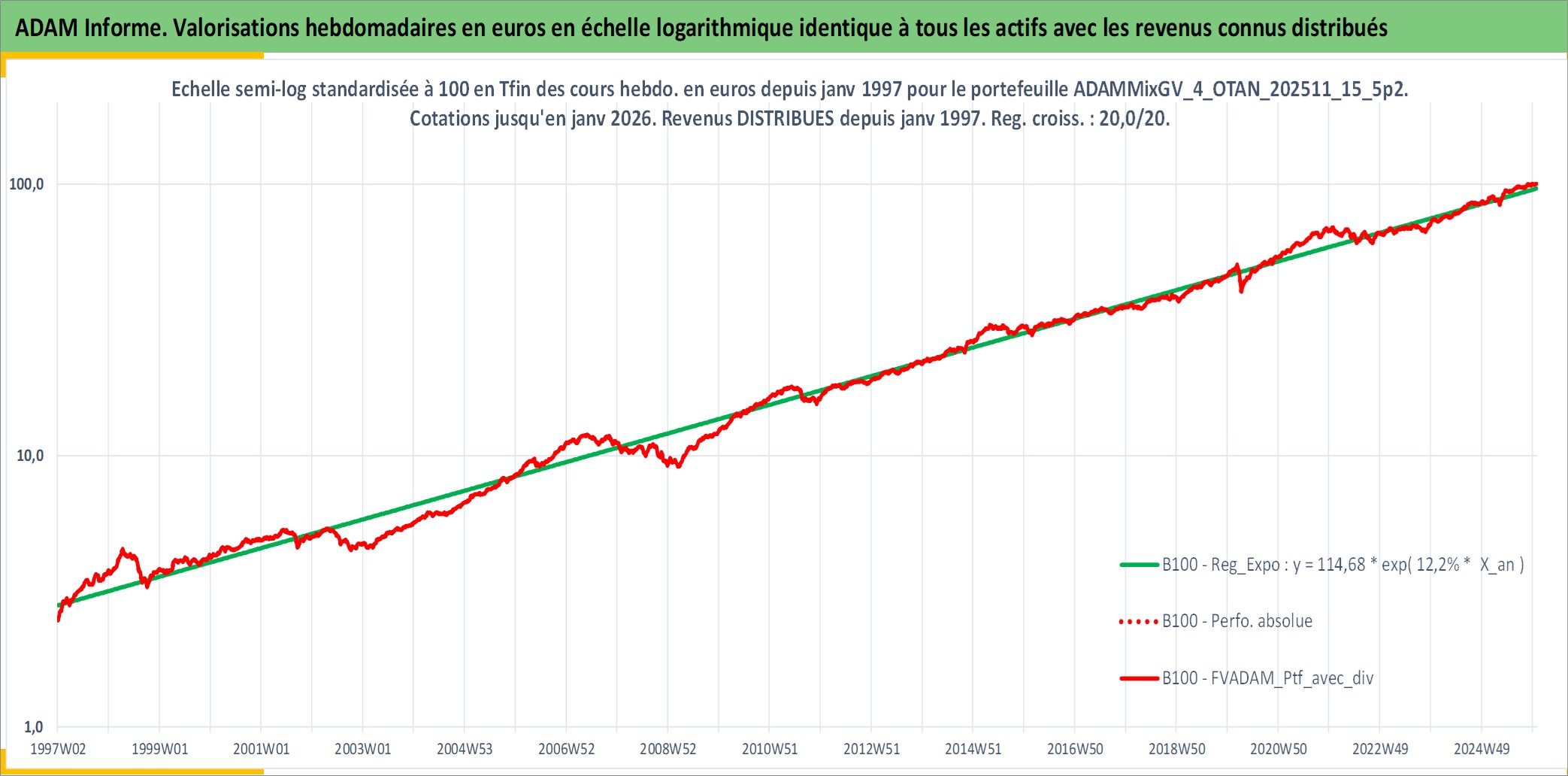Site dédié aux investisseursPage dédiée sur site financeAnalyse des valorisations hebdomadaires du portefeuille ADAMMixGV_4_OTAN_202511_15_5p2_16actifs avec un profil P6_PurActions. Ce portefeuille est cote en EUR. Les valorisations couvrent les semaines 1997W01 a 2026W01. Les revenus de cet actif financier sont pris en compte depuis la semaine 1997W01. La note globale ESG de cet actif est estimee a 13.3 (apres rebasage entre 0 et 20).