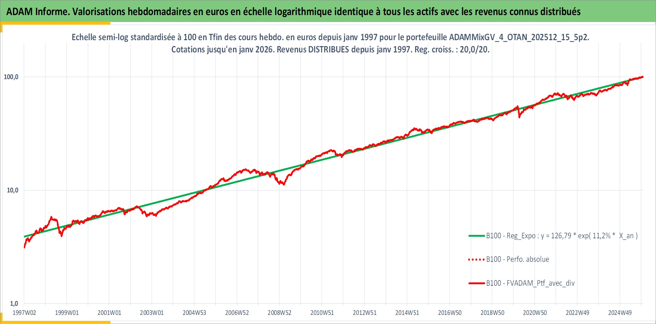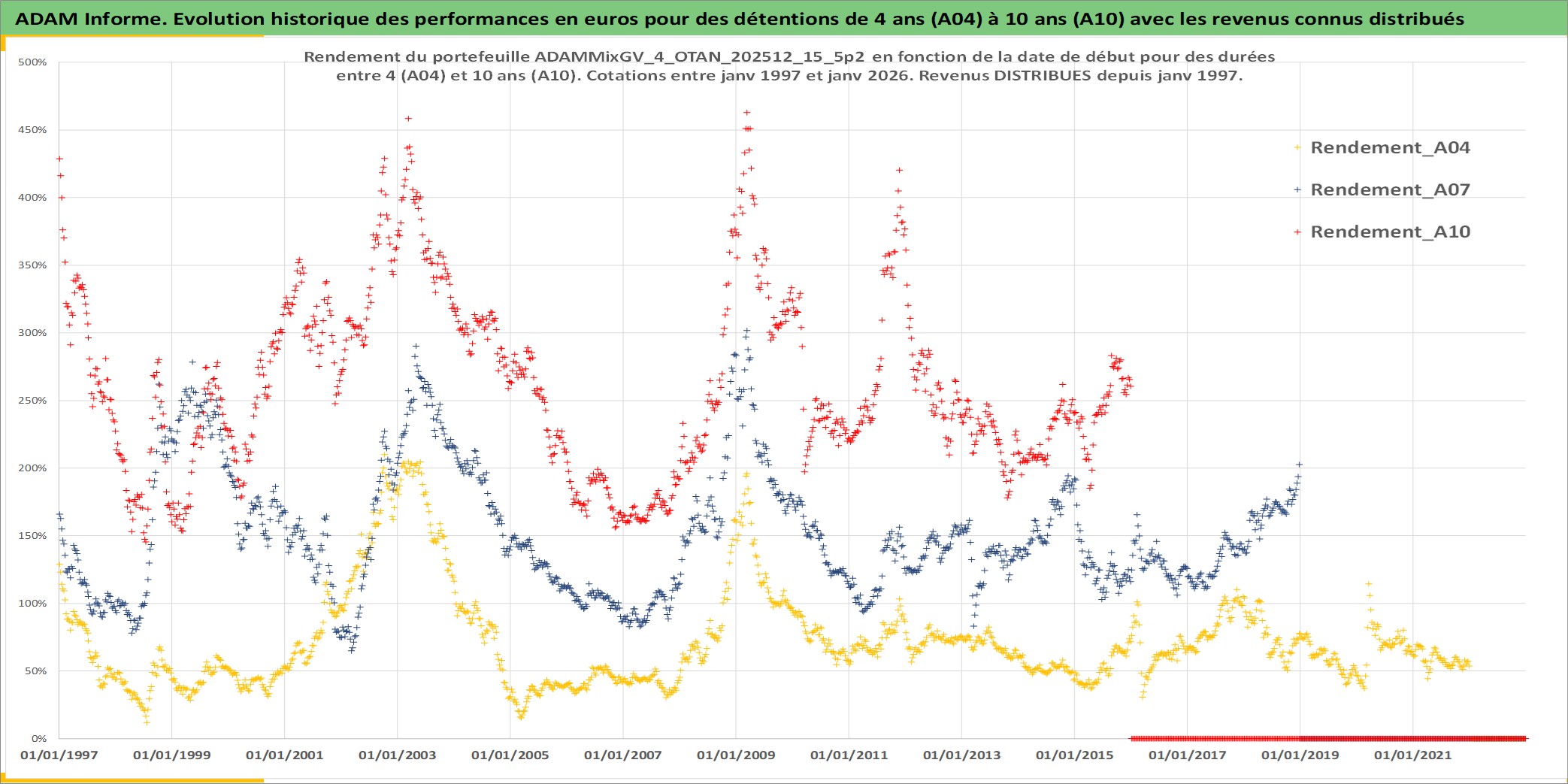Site dédié aux investisseursPage dédiée sur site financeAnalyse des valorisations hebdomadaires du portefeuille ADAMMixGV_4_OTAN_202512_15_5p2_19actifs avec un profil P6_PurActions. Ce portefeuille est cote en EUR. Les valorisations couvrent les semaines 1997W01 a 2026W01. Les revenus de cet actif financier sont pris en compte depuis la semaine 1997W01. La note globale ESG de cet actif est estimee a 13.0 (apres rebasage entre 0 et 20).